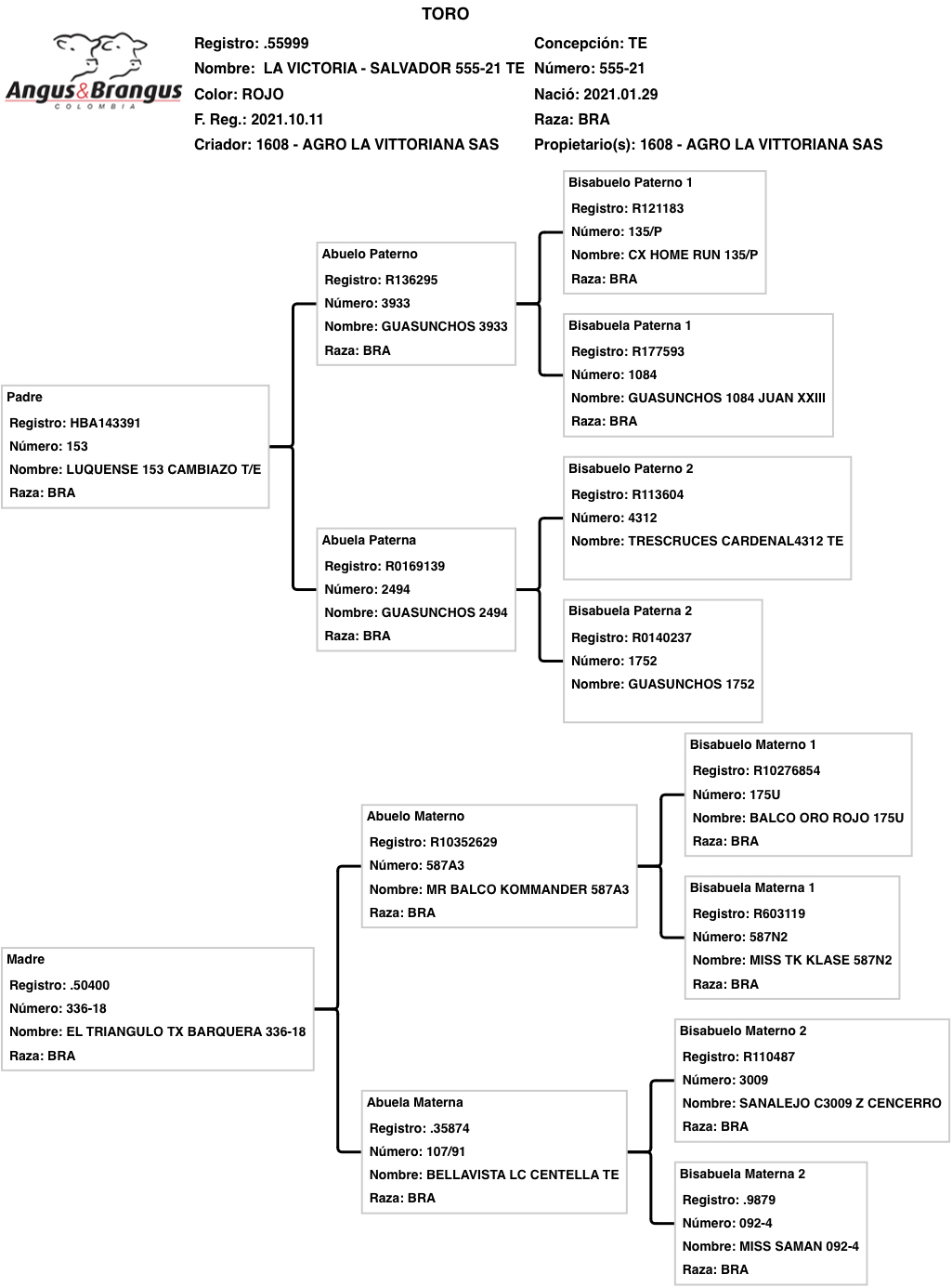 NÚMERO:555-21 FECHA DE NACIMIENTO: 29/01/2021 REGISTRO: 55999 RAZA: BRANGUS ROJO