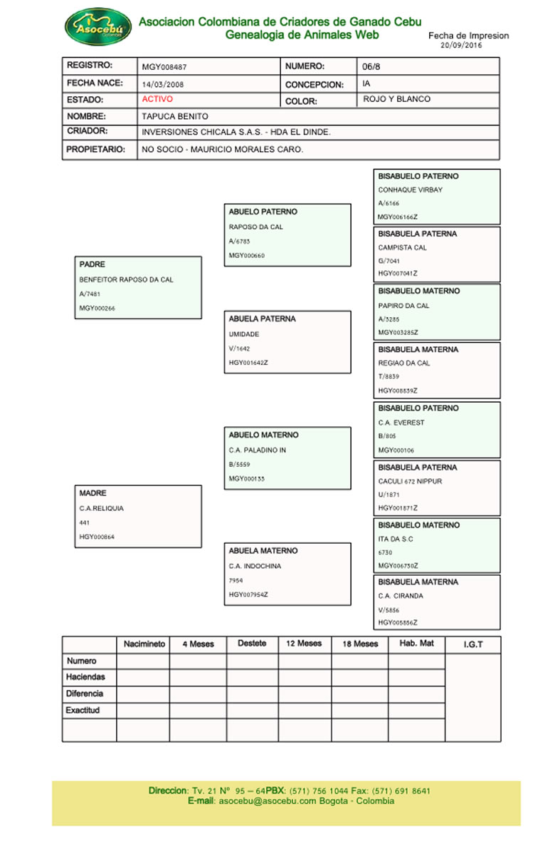 NOMBRE COMPLETO: TAPUCA BENITO NÚMERO: 06/8 REGISTRO: MGY008487 FECHA DE NACIMIENTO: 14/03/2008 TIPO: LECHE – RAZA: GYR PADRE: BENFEITOR RAPOSO DA CAL MADRE: C.A. RELIQUIA