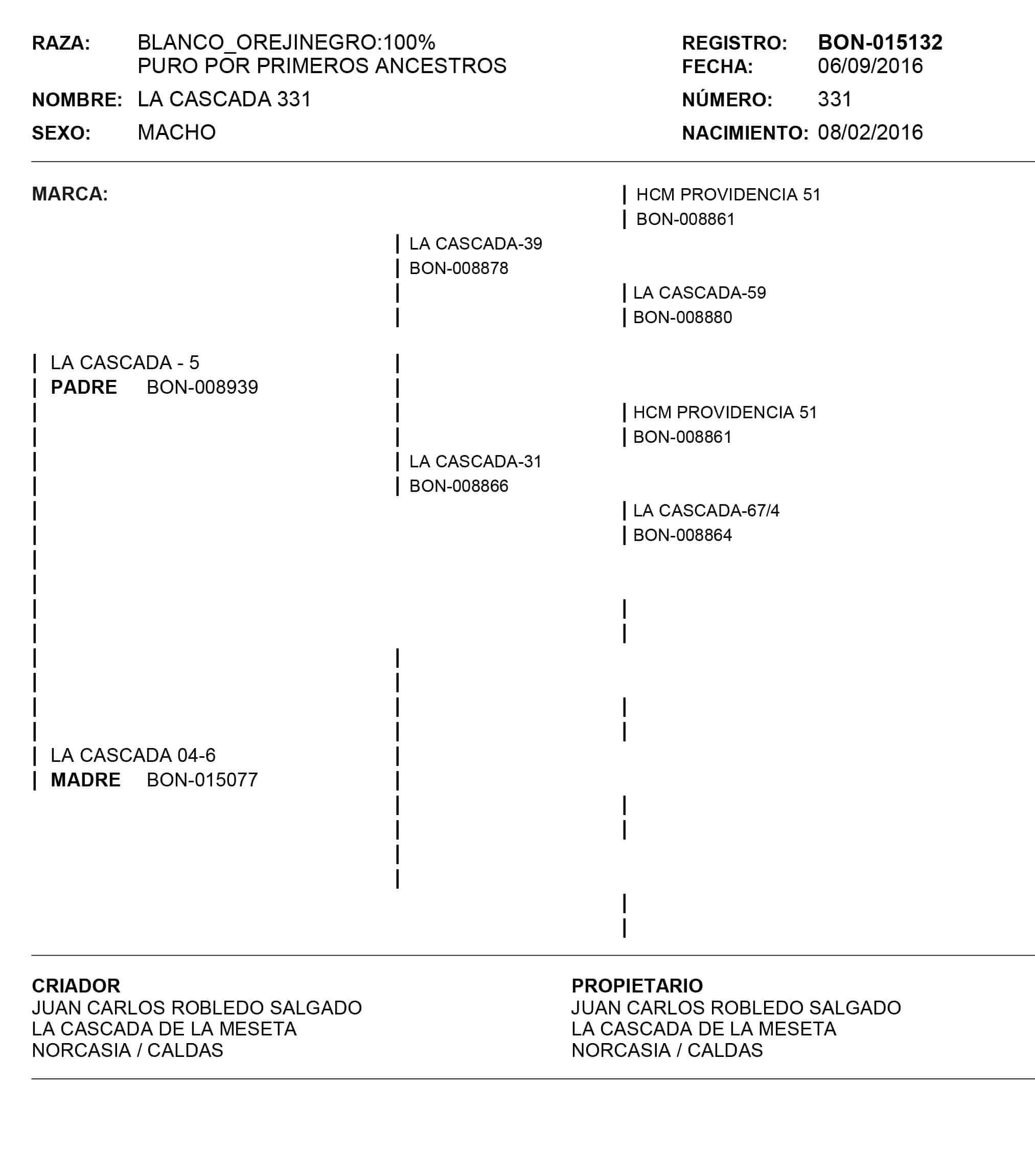 NOMBRE COMPLETO: LA CASCADA 331 – «BOLONCHO»NÚMERO: 331 REGISTRO: BON-015132 FECHA DE NACIMIENTO: 08/02/2016TIPO: D.P – RAZA: BLANCO OREJINEGRO (100%)PADRE: LA CASCADA – 5 MADRE: LA CASCADA 04-6