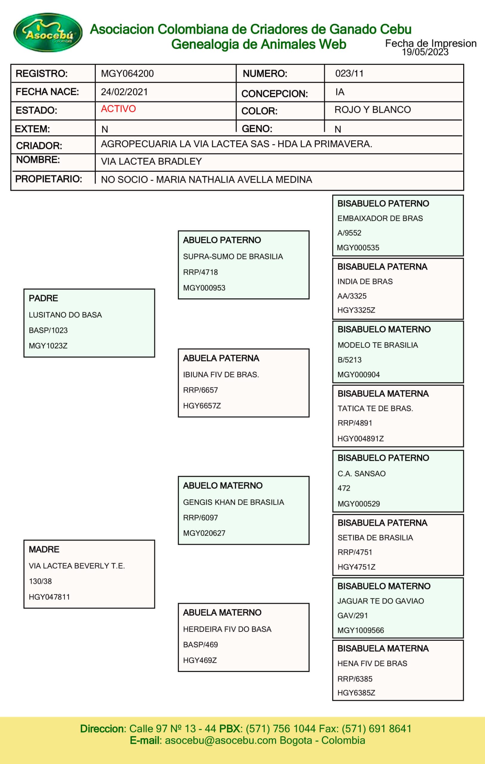 ¡Reproductor de pista! La madre, BEVERLY, donadora de VIA LACTEA campeona hembra joven en numerosas exposiciones en el 2020 en Colombia. BEVERLY, es hija del número 1 de la raza por leche. GENGIS KHAN y su madre es HERDEIRA DO BASA con lactancia superior a los 10 mil kg de leche. HERDEIRA es descendiente de OFERENDA, recordista mundial de producción y gran matriarca de la raza. En la línea alta, LUSITANO DO BASA, un toro que ha impresionado por la calidad de su progenie. Reproductor que podrá aumentar la genética de su rebaño.