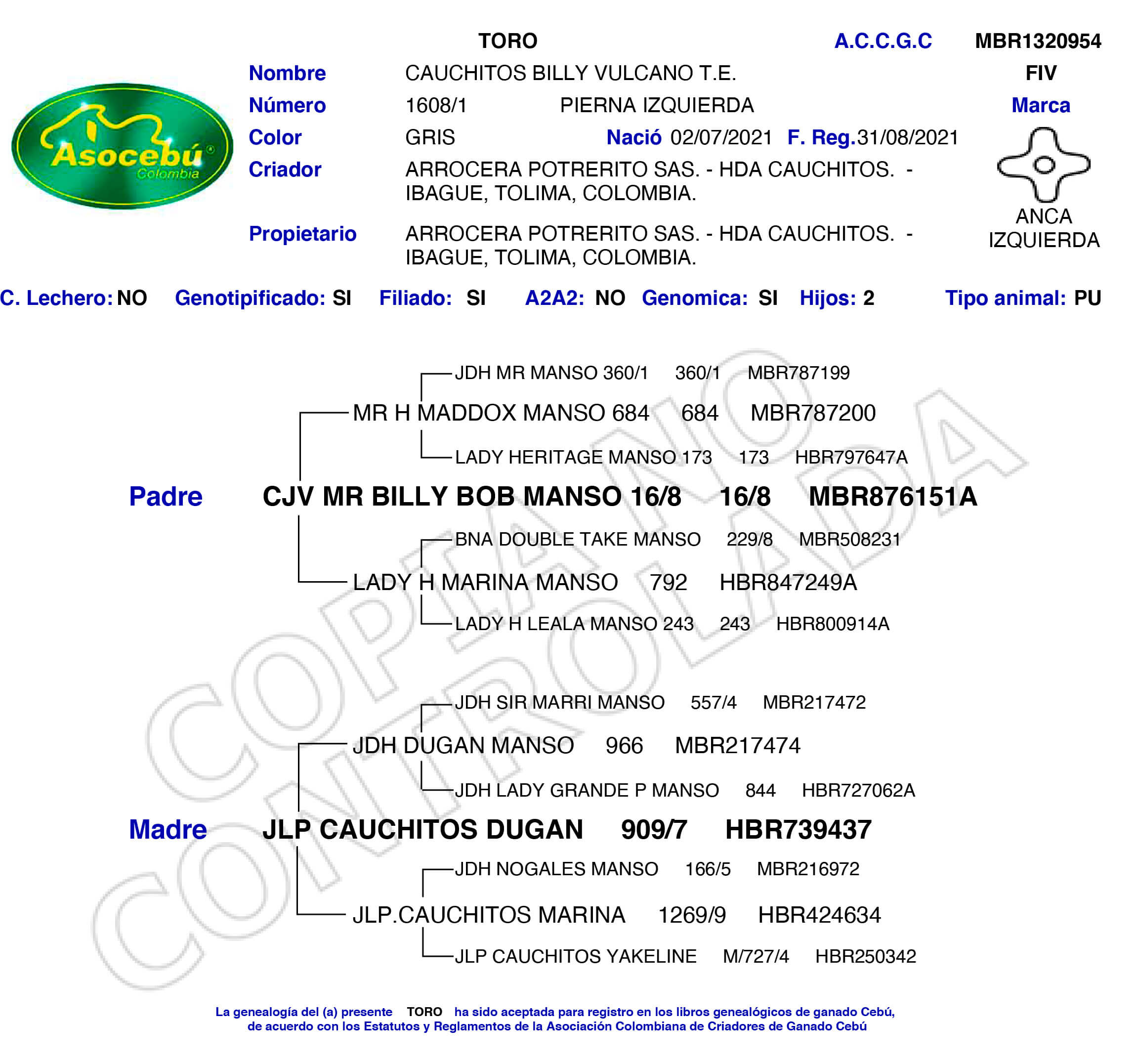 NOMBRE COMPLETO: CAUCHITOS BILLY VULCANO T.E. NÚMERO: 1608/1 REGISTRO: MBR1320954 FECHA DE NACIMIENTO: 02/07/2021 TIPO: CARNE – RAZA: BRAHMAN GRIS PADRE: CJV MR BILLY BOB MANSO 16/8 MADRE: JLP CAUCHITOS DUGAN 909/7