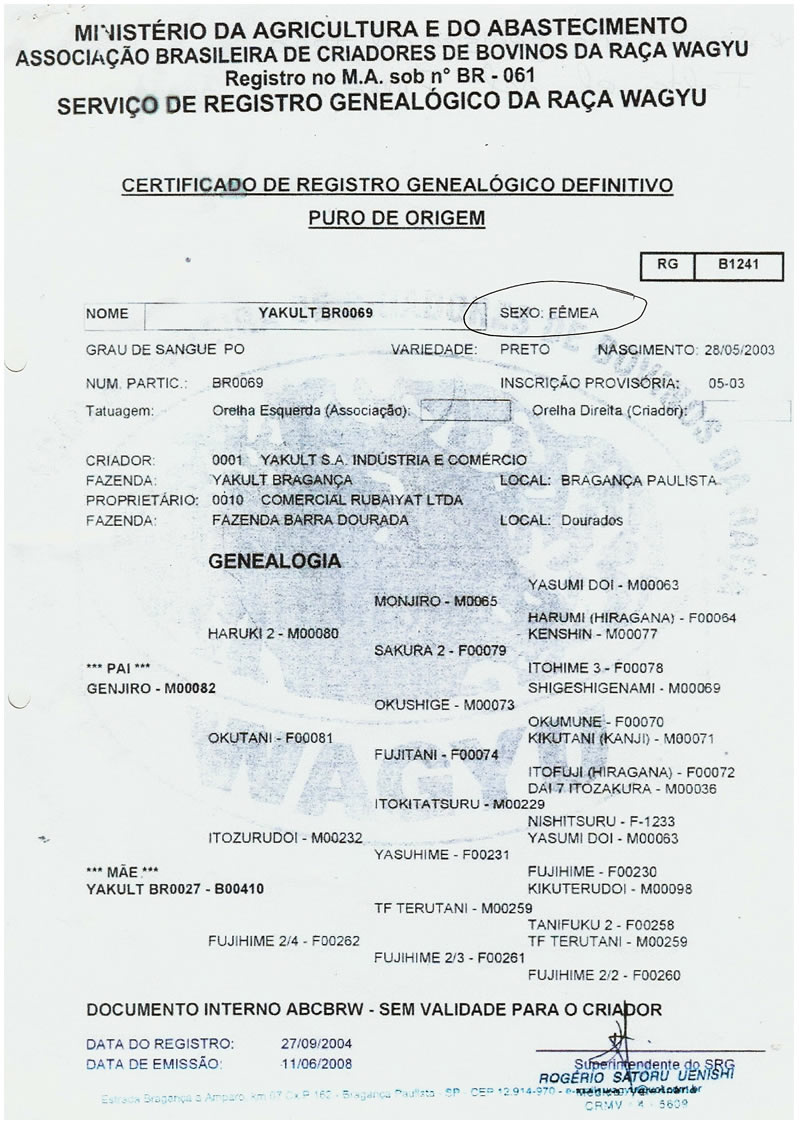 NOMBRE COMPLETO: W02 Chiyo 10002NÚMERO: 10002 REGISTRO: 603111 TIPO: CARNERAZA: WAGYUPADRE: GENJIRO MADRE: YAKULT