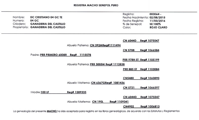 NOMBRE COMPLETO: DC CRISTIANO 04 GC TENÚMERO: 04 GC REGISTRO: 003064 FECHA DE NACIMIENTO: 02/08/2015TIPO: CARNE – RAZA: SENEPOLPADRE: PRR PRIMERO 6008R MADRE: 100 LF
