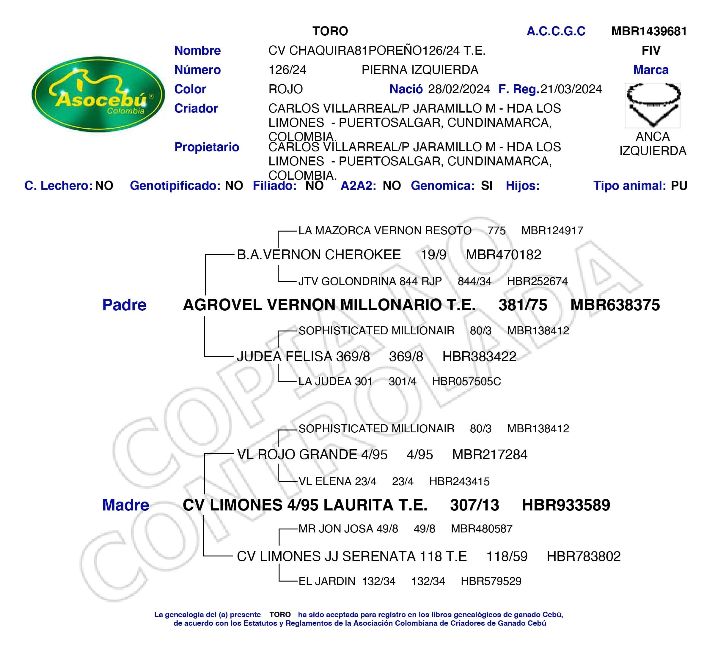 NOMBRE COMPLETO: CV CHAQUIRA81 POREÑO 126/24 T.E. NÚMERO: 126/24 REGISTRO: MBR1439681 FECHA DE NACIMIENTO: 28/02/2024 TIPO: CARNE – RAZA: BRAHMAN ROJO PADRE: AGROVEL VERNON MILLONARIO T.E. 381/75 MADRE: CV LIMONES 4/95 LAURITA T.E. 307/13
