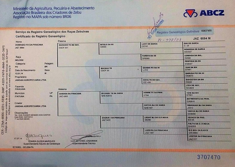 NOMBRE COMPLETO: Dobrado FIV Da Picarana Jaz 6084MNÚMERO: Jaz 6084M REGISTRO: 00837855 FECHA DE NACIMIENTO: 12/01/2014TIPO: CARNE – RAZA: NELOREPADRE: OUINCHO TE DE NAV MADRE: ANANDA DA PICARANA