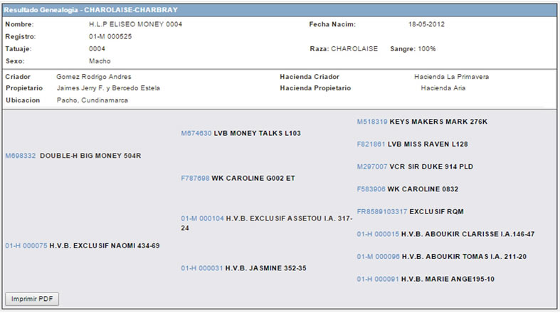 NOMBRE COMPLETO: H.L.P. ELISEO MONEY 0004 NÚMERO: 0004 REGISTRO: 01-M 000525 FECHA DE NACIMIENTO: 18/05/2012 TIPO: CARNE – RAZA: CHAROLAIS PADRE: DOUBLE H BIG MONEY MADRE: HVB EXCLUSIF NAOMI