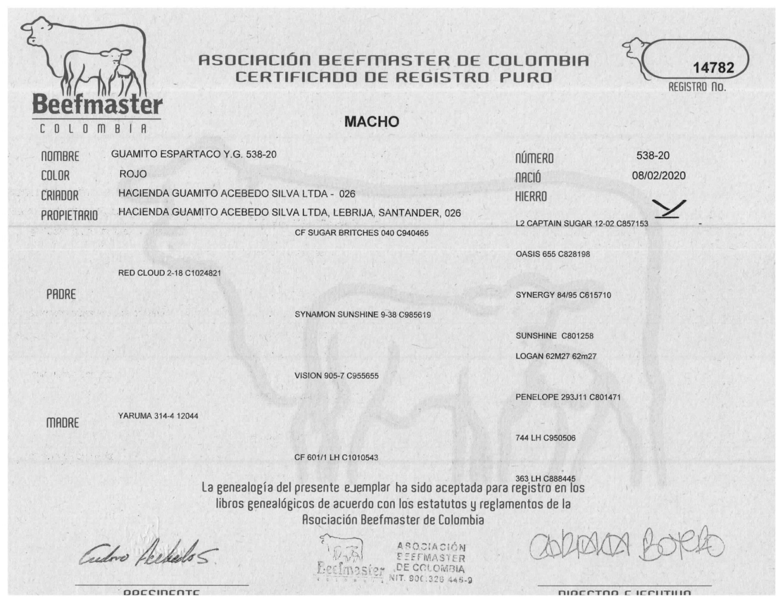 NOMBRE COMPLETO: GUAMITO ESPARTACO Y.G. 538-2NÚMERO: 538-20 REGISTRO: 14782 FECHA DE NACIMIENTO: 08/02/2020TIPO: CARNE – RAZA: BEEFMASTERPADRE: RED CLOUD 2-18 MADRE: YARUMA 314-4