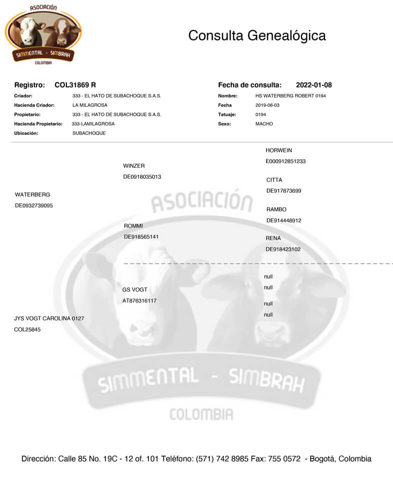 NOMBRE COMPLETO: HS WATERBERG ROBERT 0194NÚMERO: 0194 REGISTRO: COL31869 R FECHA DE NACIMIENTO: 03/06/2019TIPO: D.P. – RAZA: SIMMENTALPADRE: WATERBERG MADRE: JYS VOGT CAROLINA 0127