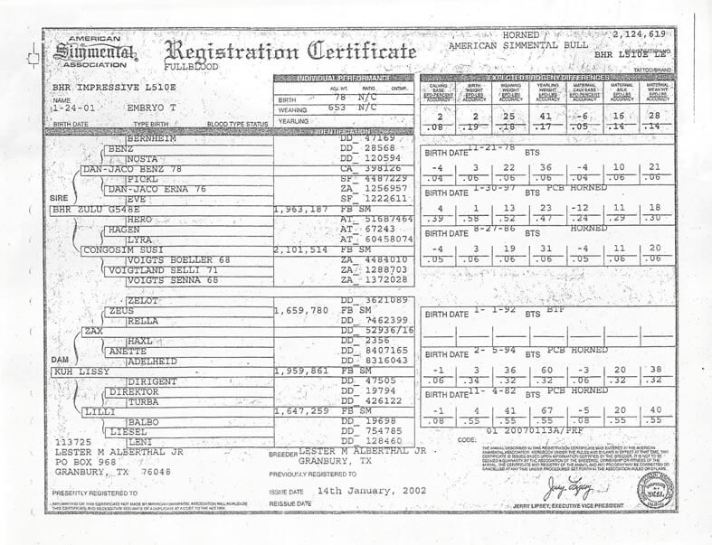 NOMBRE COMPLETO: BHR Impressive L510ENÚMERO: L510E REGISTRO: 2.124.619 FECHA DE NACIMIENTO: 24/01/2001TIPO: D.P. – RAZA: SIMMENTALPADRE: BHR ZULU MADRE: KUH LISSY