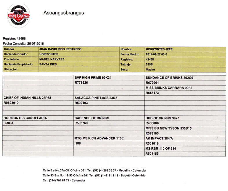 NOMBRE COMPLETO: HORIZONTES JEFE NÚMERO: 525B REGISTRO: 42468 FECHA DE NACIMIENTO: 27/09/2014 TIPO: CARNE – RAZA: BRANGUS PADRE: CHIEF OF INDIAN HILLS 23P68 MADRE: HORIZONTES CANDELARIA