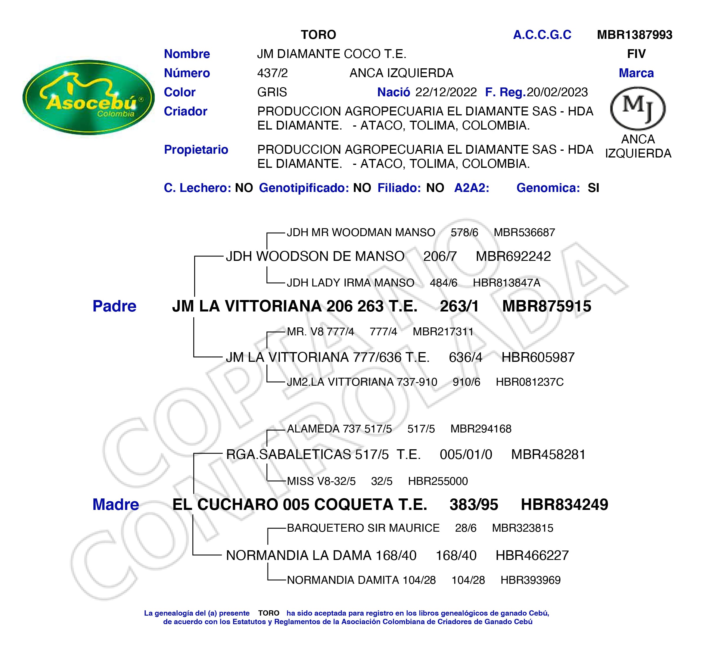 NOMBRE COMPLETO: JM DIAMANTE COCO T.E. NÚMERO: 437/2 REGISTRO: MBR1387993 FECHA DE NACIMIENTO: 22/12/2022 TIPO: CARNE – RAZA: BRAHMAN GRIS PADRE: JM LA VITTORIANA 206 263 T.E. MADRE: EL CUCHARO 005 COQUETA T.E.