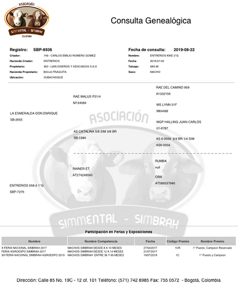 NOMBRE COMPLETO: ENTRERIOS KIKE 2°GNÚMERO: 089-36 REGISTRO: SBP-8936 FECHA DE NACIMIENTO: 03/07/2016TIPO: CARNE – RAZA: SIMBRAHPADRE: LA ESMERALDA DON ENRIQUEMADRE: ENTRERIOS 058-2 1°G