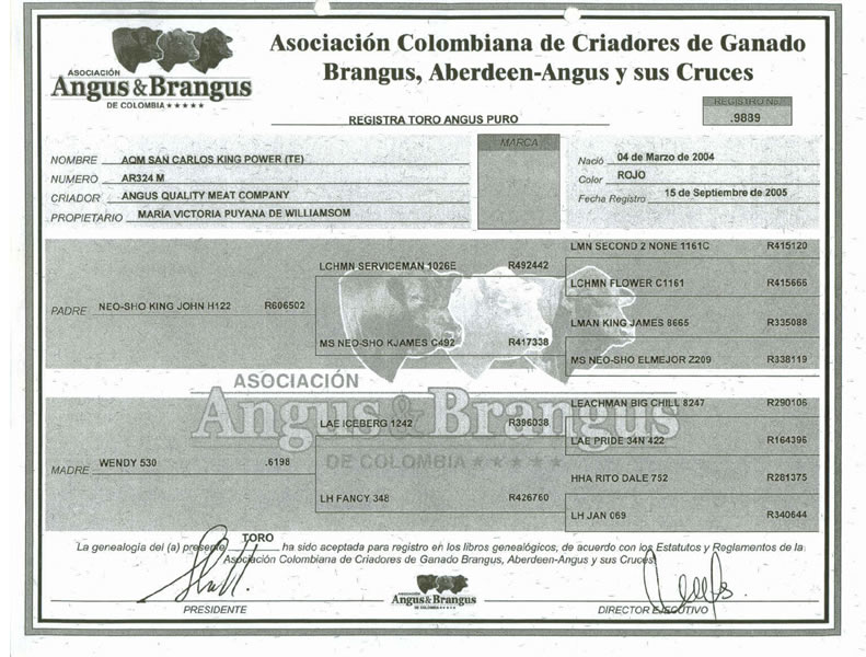 NOMBRE COMPLETO: SC. King Power TE 324 M NÚMERO: Ar 234 M REGISTRO: 9839 FECHA DE NACIMIENTO: 03/04/2004 TIPO: CARNE – RAZA: ANGUS ROJO PADRE: NEO SHO KING H122 MADRE: WENDY 530