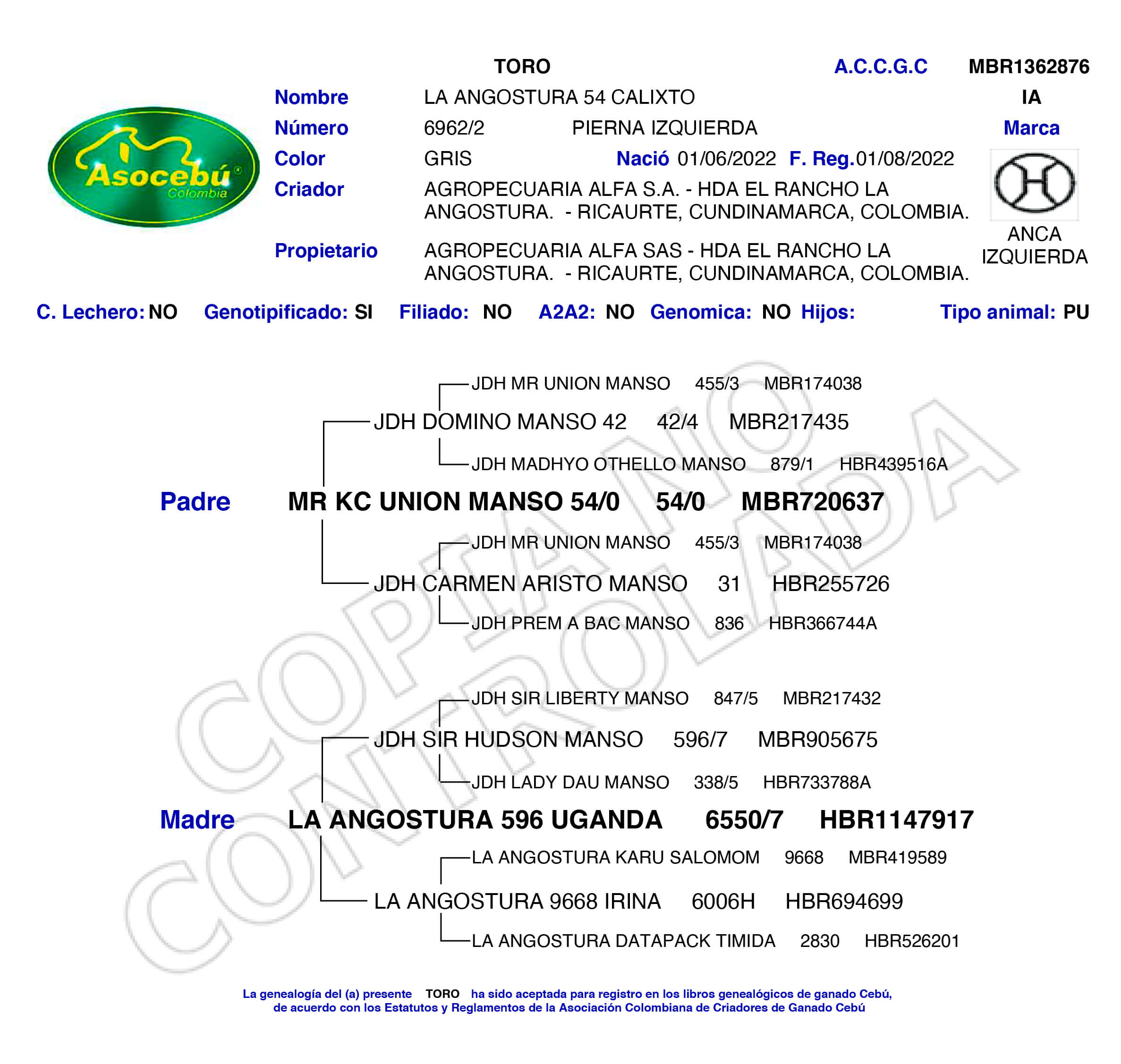 NOMBRE COMPLETO: LA ANGOSTURA 54 CALIXTO NÚMERO: 6962/2 REGISTRO: MBR1362876 FECHA DE NACIMIENTO: 01/06/2022 TIPO: CARNE – RAZA: BRAHMAN GRIS PADRE: MR KC UNION MANSO 54/0 MADRE: LA ANGOSTURA 596 UGANDA