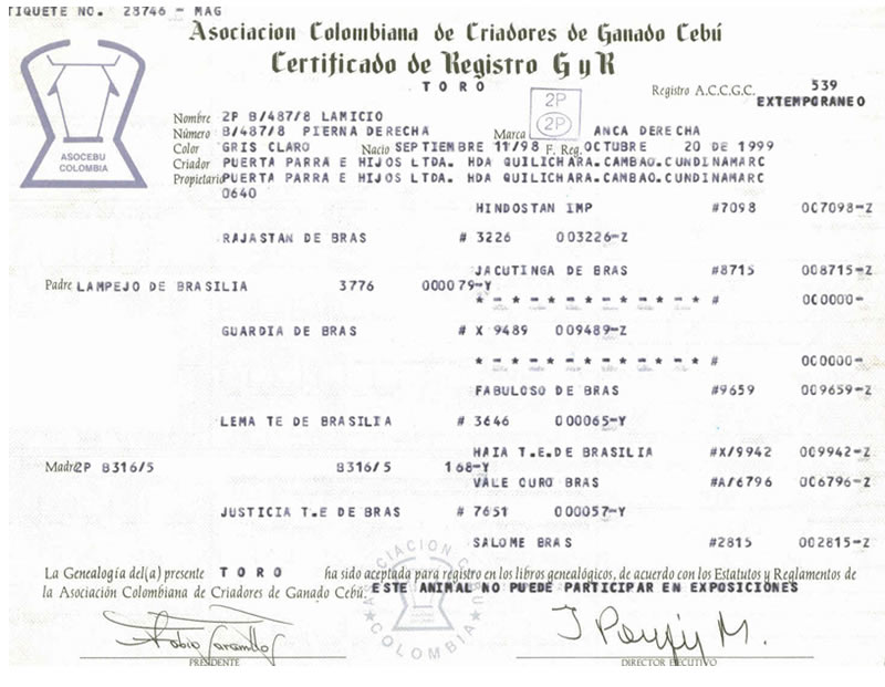 NOMBRE COMPLETO: 2P LAMICIO B/487/8 NÚMERO: B/487/8 REGISTRO: 539 FECHA DE NACIMIENTO: 11/09/1998 TIPO: LECHE – RAZA: GYR PADRE: LAMPEJO DE BRASILIA MADRE: 2P B316/5