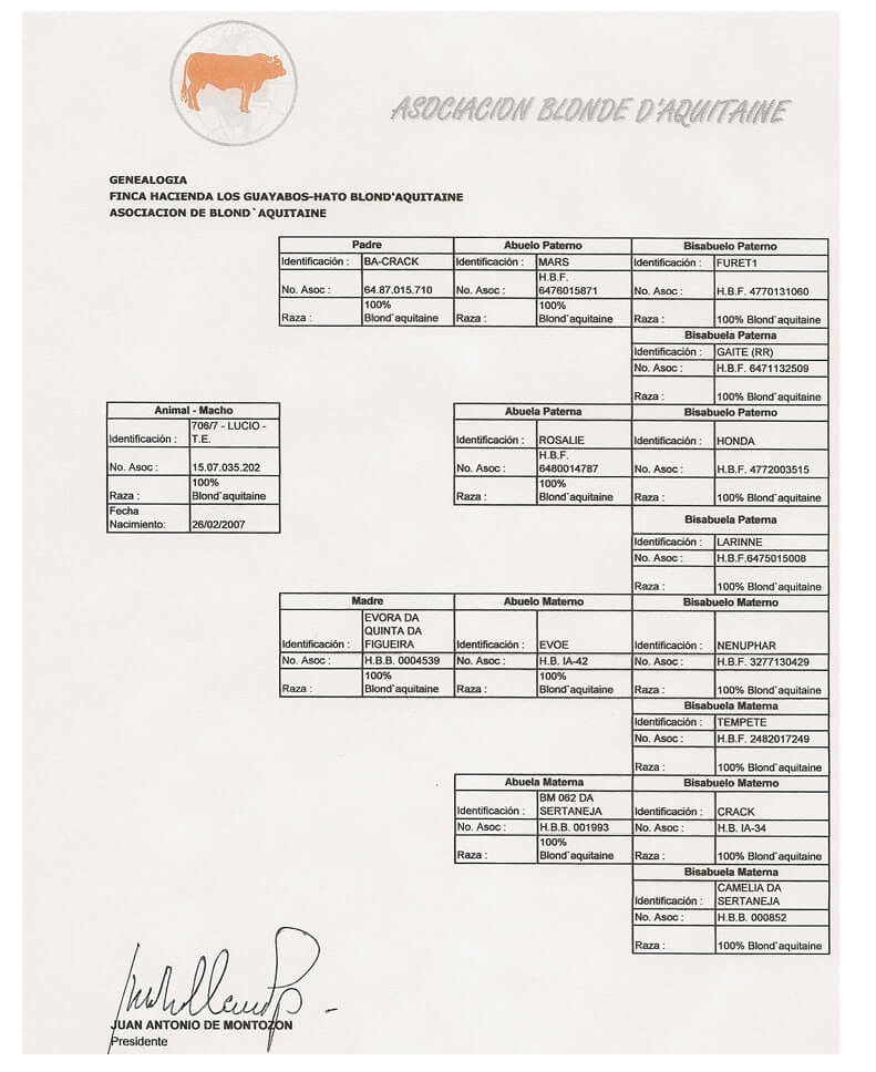 NOMBRE COMPLETO: LUCIO TE 706/7 NÚMERO: 706/7 REGISTRO: 1507035202 FECHA DE NACIMIENTO: 26/02/2007 TIPO: CARNE – RAZA: BLONDE D’AQUITAINE PADRE: BA-CRACK MADRE: EVORA DA QUINTA DA FIGUEIRA