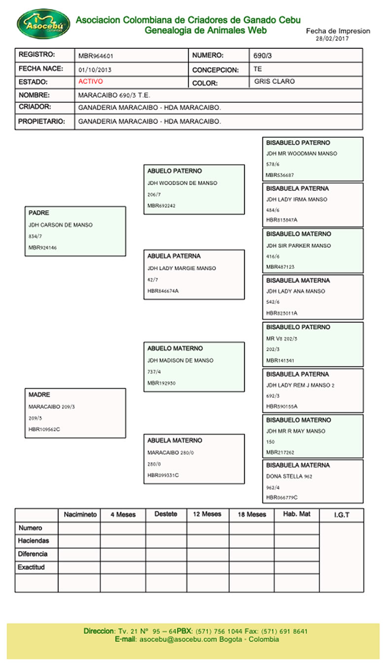 NOMBRE COMPLETO: MARACAIBO 690/3 T.E. NÚMERO: 690/3 REGISTRO: MBR 964601 FECHA DE NACIMIENTO: 01/10/2013 TIPO: CARNE – RAZA: BRAHMAN GRIS PADRE: JDH CARSON DE MANSO 834/7 MADRE: MARACAIBO 209/3