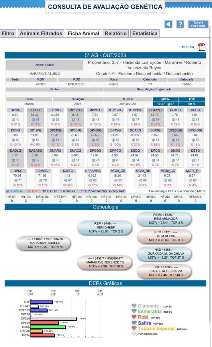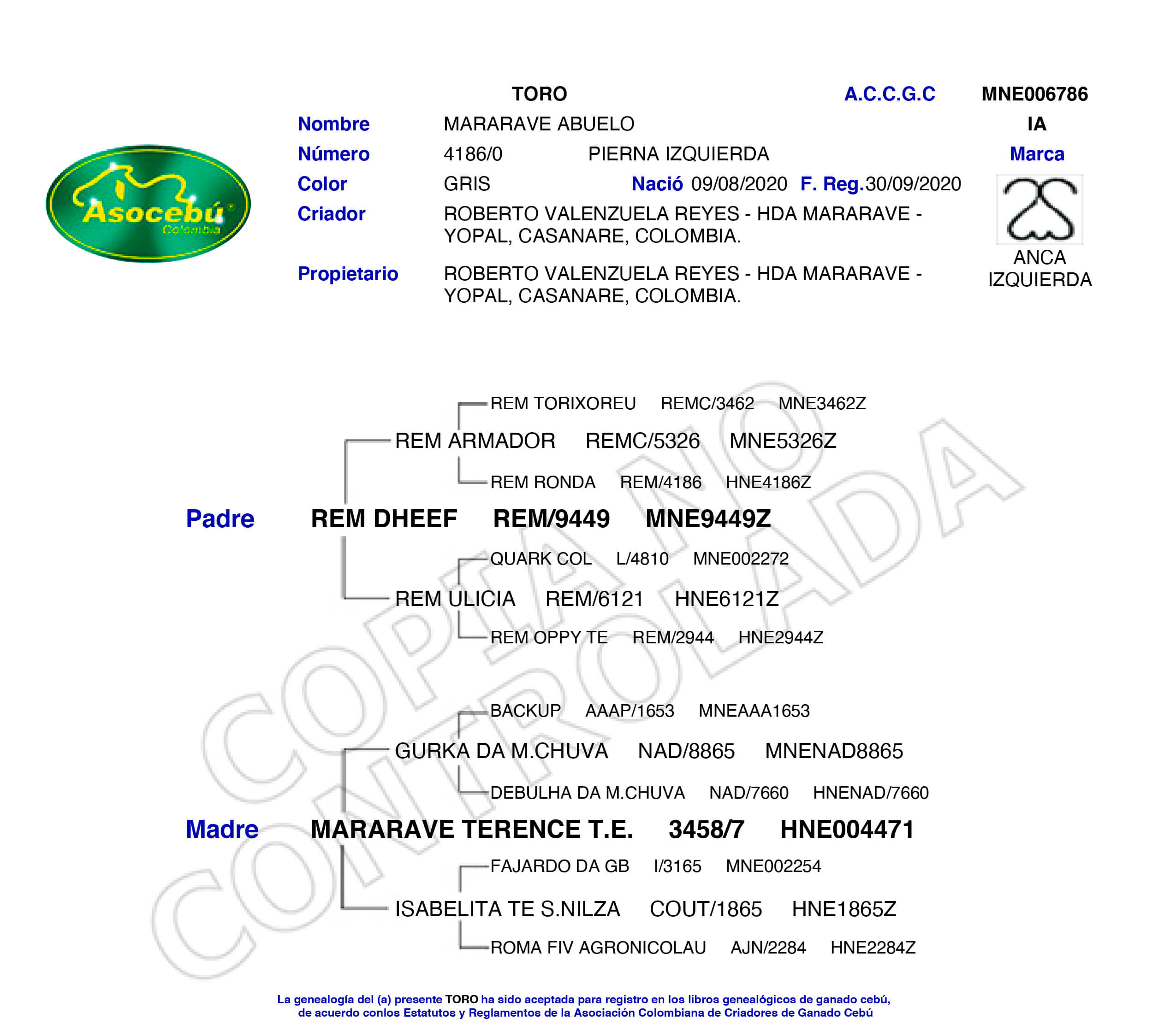 NOMBRE COMPLETO: MARARAVE ABUELONÚMERO: 4186/0 REGISTRO: MNE006786 FECHA DE NACIMIENTO: 09/08/2020TIPO: CARNE – RAZA: NELOREPADRE: REM DHEEF MADRE: MARARAVE TERENCE T.E.