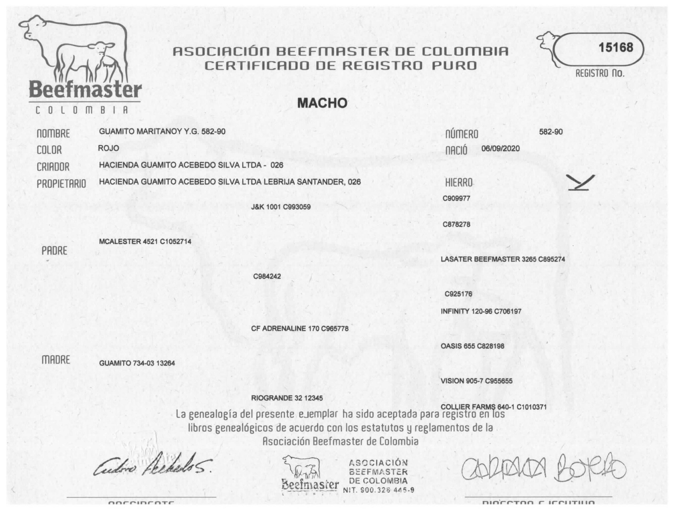 NOMBRE COMPLETO: GUAMITO MARITANOY Y.G. 582-90NÚMERO: 582-90 REGISTRO: 15168 FECHA DE NACIMIENTO: 06/09/2020TIPO: CARNE – RAZA: BEEFMASTERPADRE: MCALESTER 4521 MADRE: GUAMITO 734-03