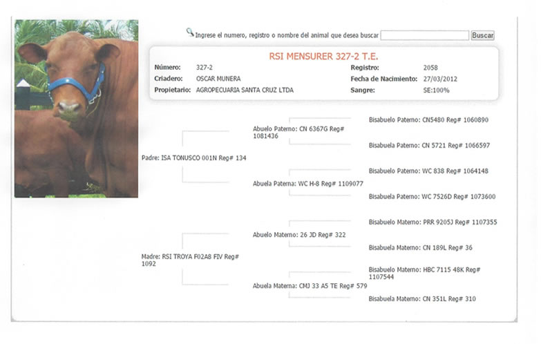 NOMBRE COMPLETO: RSI MENSURER 327-2 T.E.NÚMERO: 327-2 REGISTRO: 2058 FECHA DE NACIMIENTO: 27/03/2012TIPO: CARNE – RAZA: SENEPOLPADRE: ISA TONUSCO 001 MADRE: RSI TROYA FO2A8