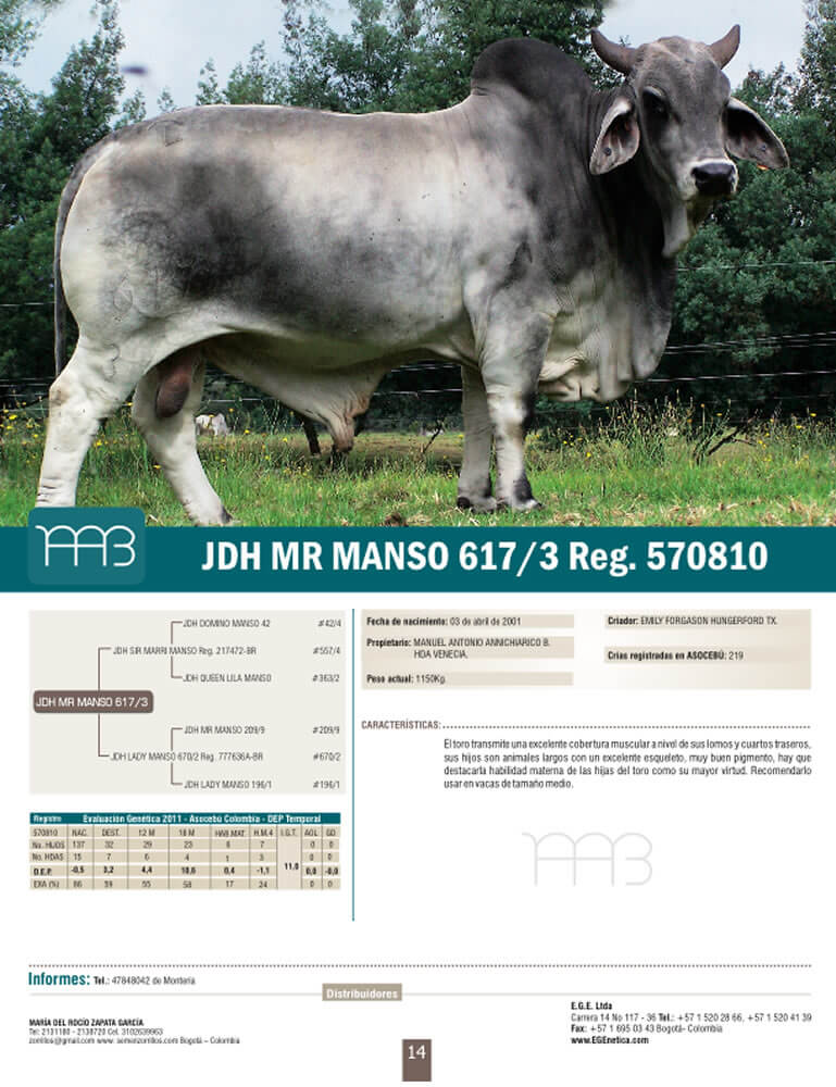 NOMBRE COMPLETO: JDH MR. MANSO 617/3 NÚMERO: 617/3 REGISTRO: 570810 FECHA DE NACIMIENTO: 04/03/2001 TIPO: CARNE – RAZA: BRAHMAN GRIS PADRE: JDH SIR MARRI MANSO 557/4 MADRE: JDH LADY MANSO 670/2