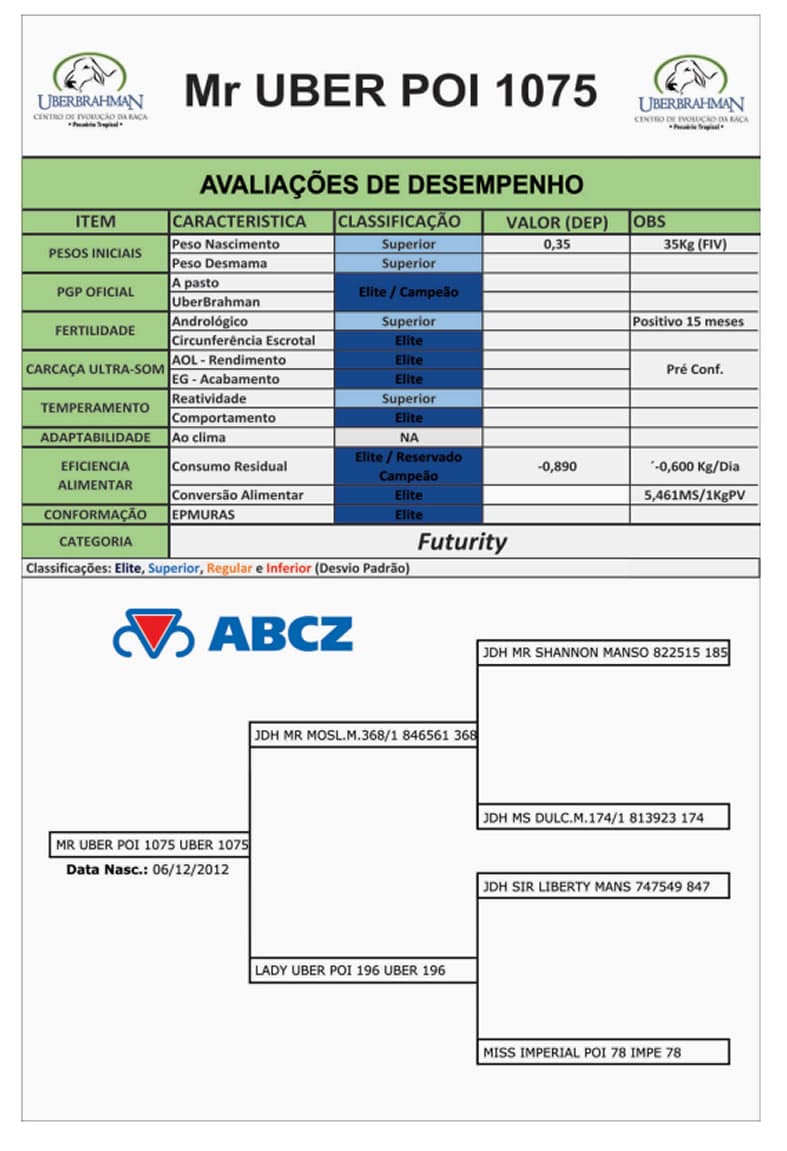 - Mr UBER Tanque 1075 es Campeón de Desempeño en Pastura y Campeón Reservado en Prueba de Eficiencia Alimenticia, siendo Élite para todas las características de Carcasa.