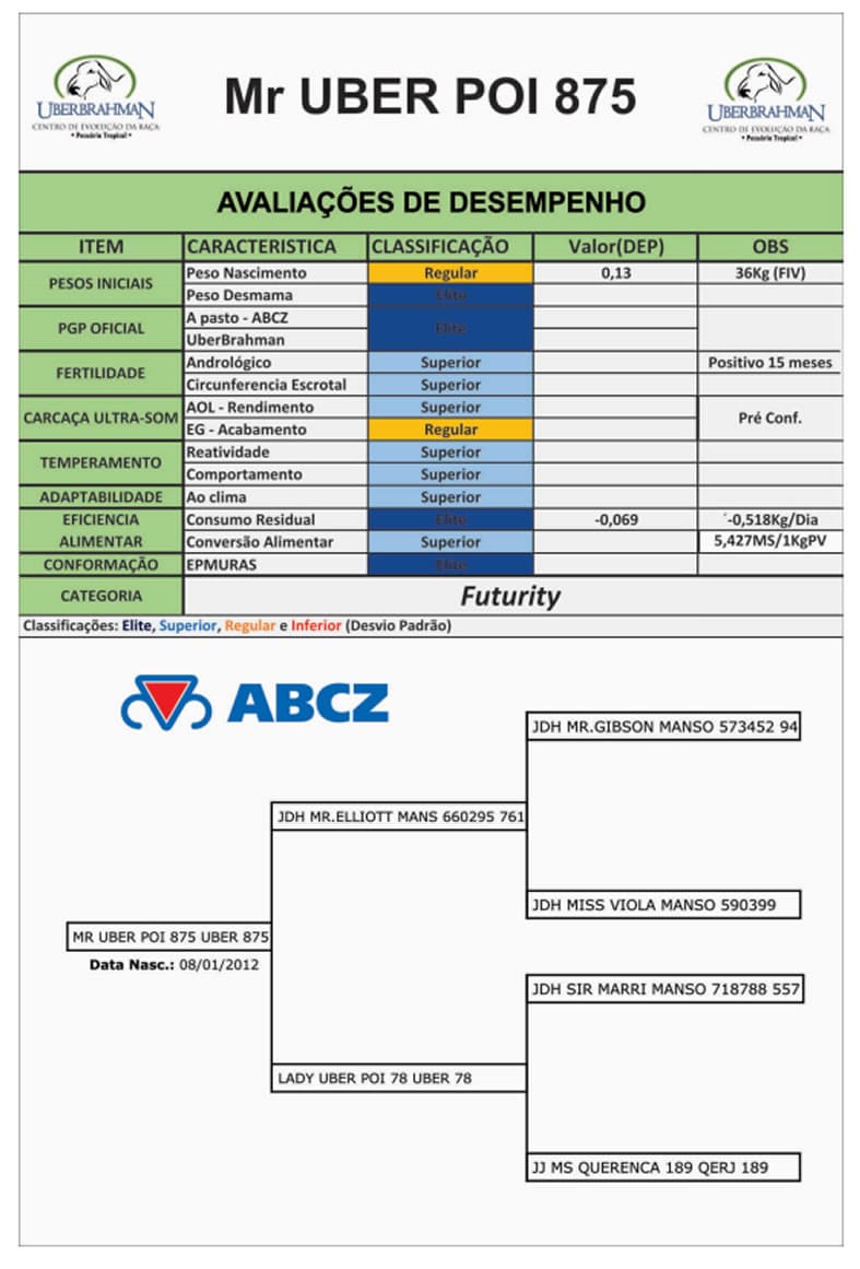 - Mr UBER POI 875 es Élite en Prueba de Desempeño ABCZ / UberBrahman y Superior en Prueba de Eficiencia Alimenticia.