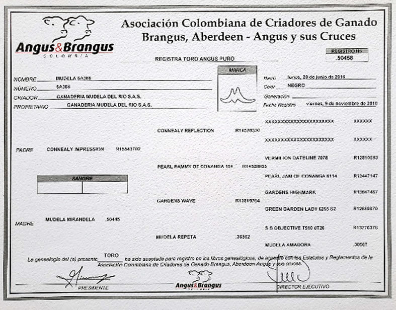NOMBRE COMPLETO: MUDELA 6A388NÚMERO: 6A388 REGISTRO: 50458 FECHA DE NACIMIENTO: 20/06/2016TIPO: CARNE – RAZA: ANGUS NEGROPADRE: CONNEALY IMPRESSION MADRE: MUDELA MIRANDELA