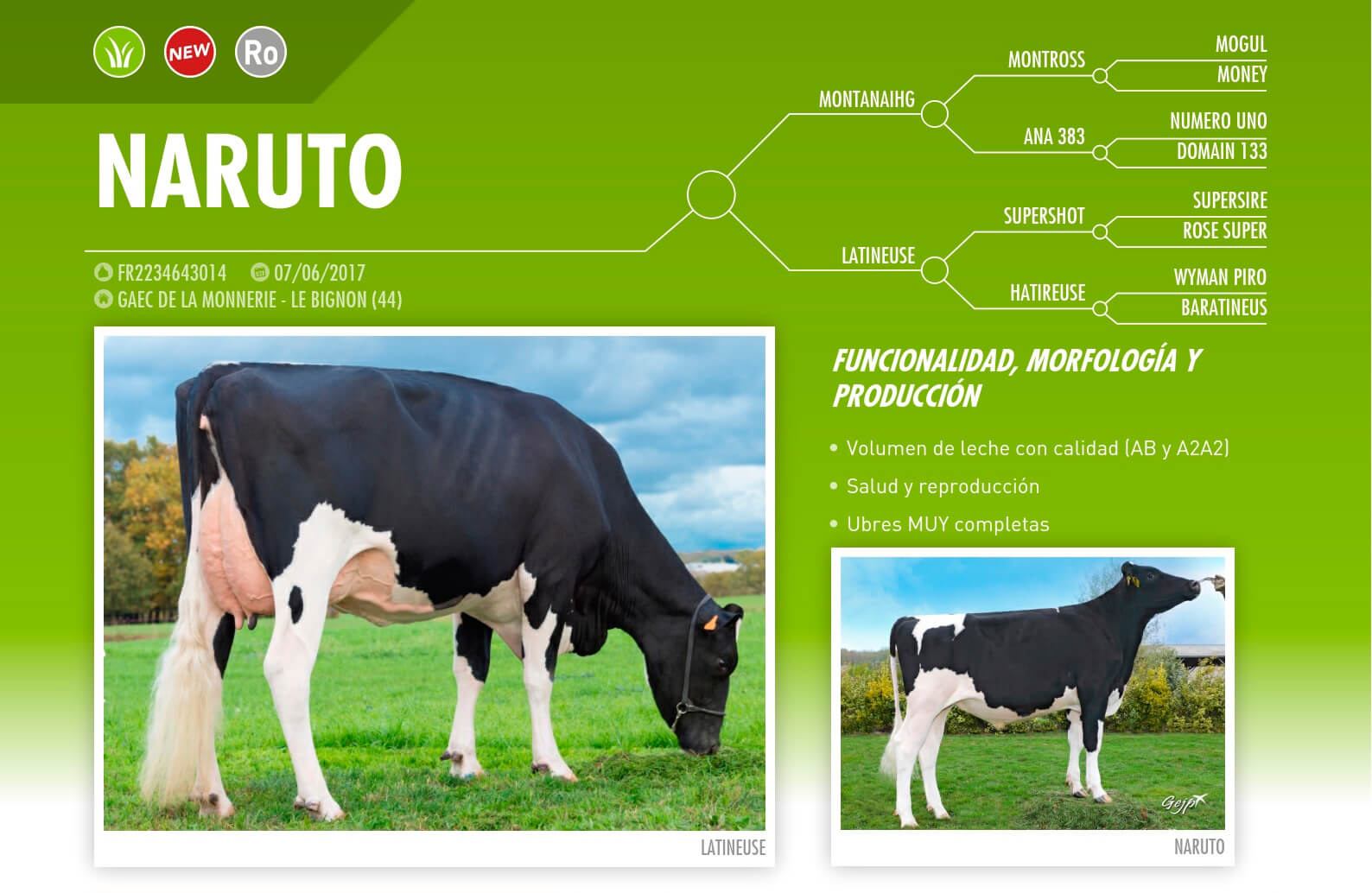 NOMBRE COMPLETO: NARUTONÚMERO: N/A REGISTRO: FR2234643014 FECHA DE NACIMIENTO: 07/06/2017TIPO: LECHE – RAZA: HOLSTEIN NEGROPADRE: MONTANAIHG MADRE: LATINEUSE