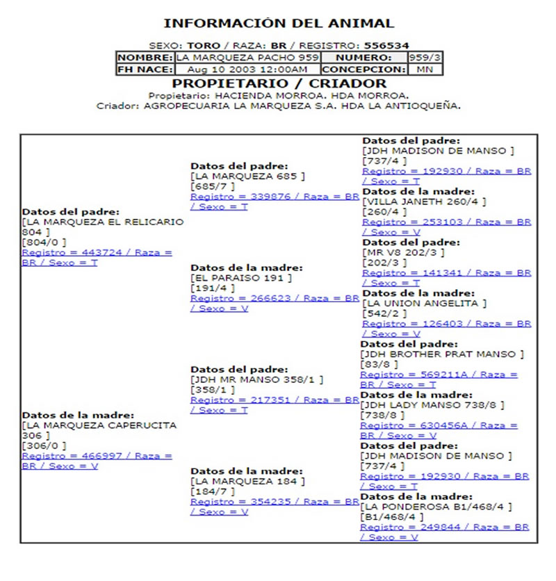 NOMBRE COMPLETO: LA MARQUEZA PACHO 959/3 NÚMERO: 959/3 REGISTRO: 556534 FECHA DE NACIMIENTO: 08/10/2003 TIPO: CARNE – RAZA: BRAHMAN GRIS PADRE: LA MARQUEZA EL RELICARIO MADRE: LA MARQUEZA CAPERUCITA