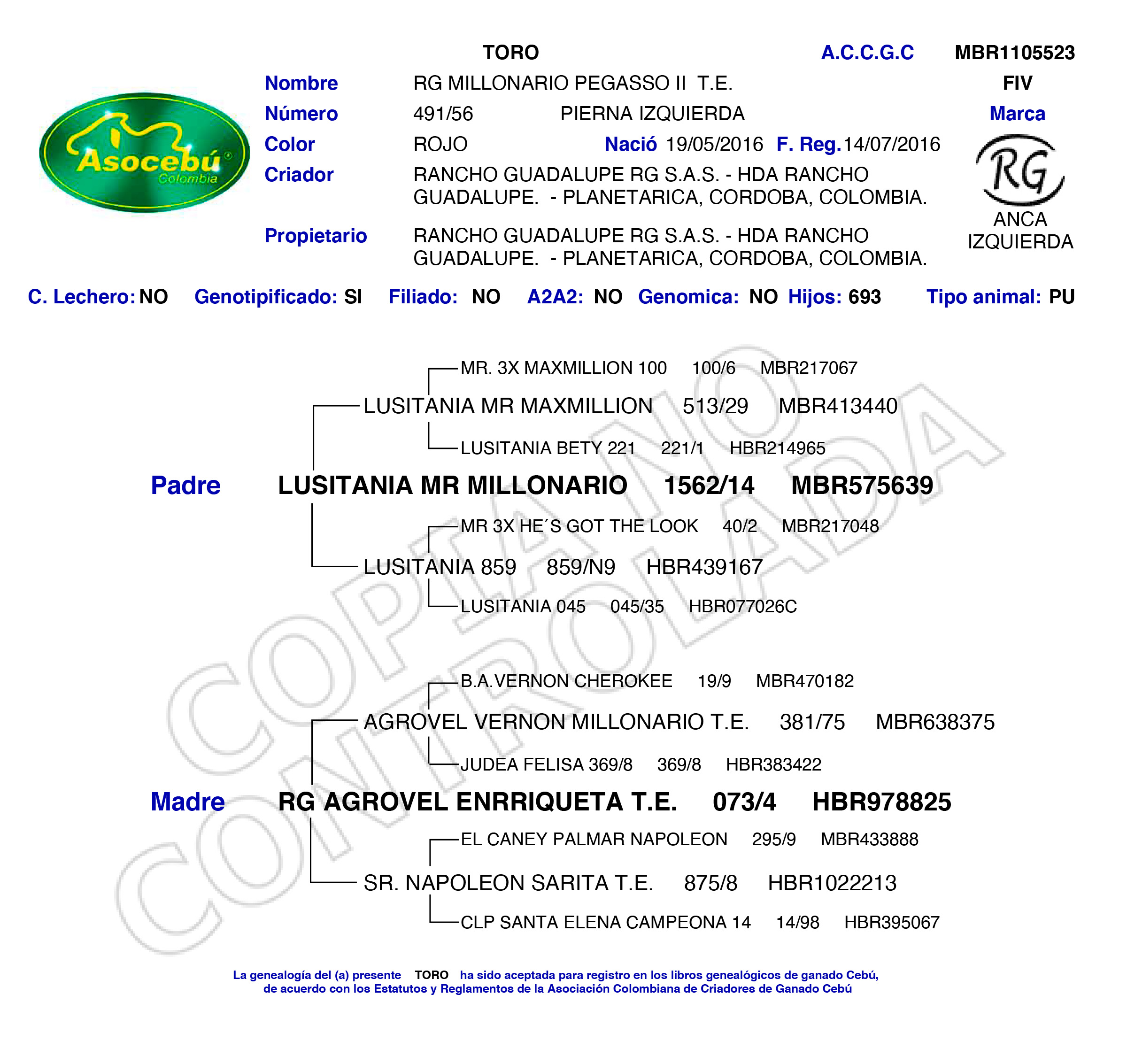 NOMBRE COMPLETO: RG MILLONARIO PEGASSO II T.E. NÚMERO: 491/56 REGISTRO: MBR1105523 FECHA DE NACIMIENTO: 19/05/2016 TIPO: CARNE – RAZA: BRAHMAN ROJO PADRE: LUSITANIA MR MILLONARIO 1562/14 MBR575639 MADRE: RG AGROVEL ENRRIQUETA T.E. 073/4 HBR978825