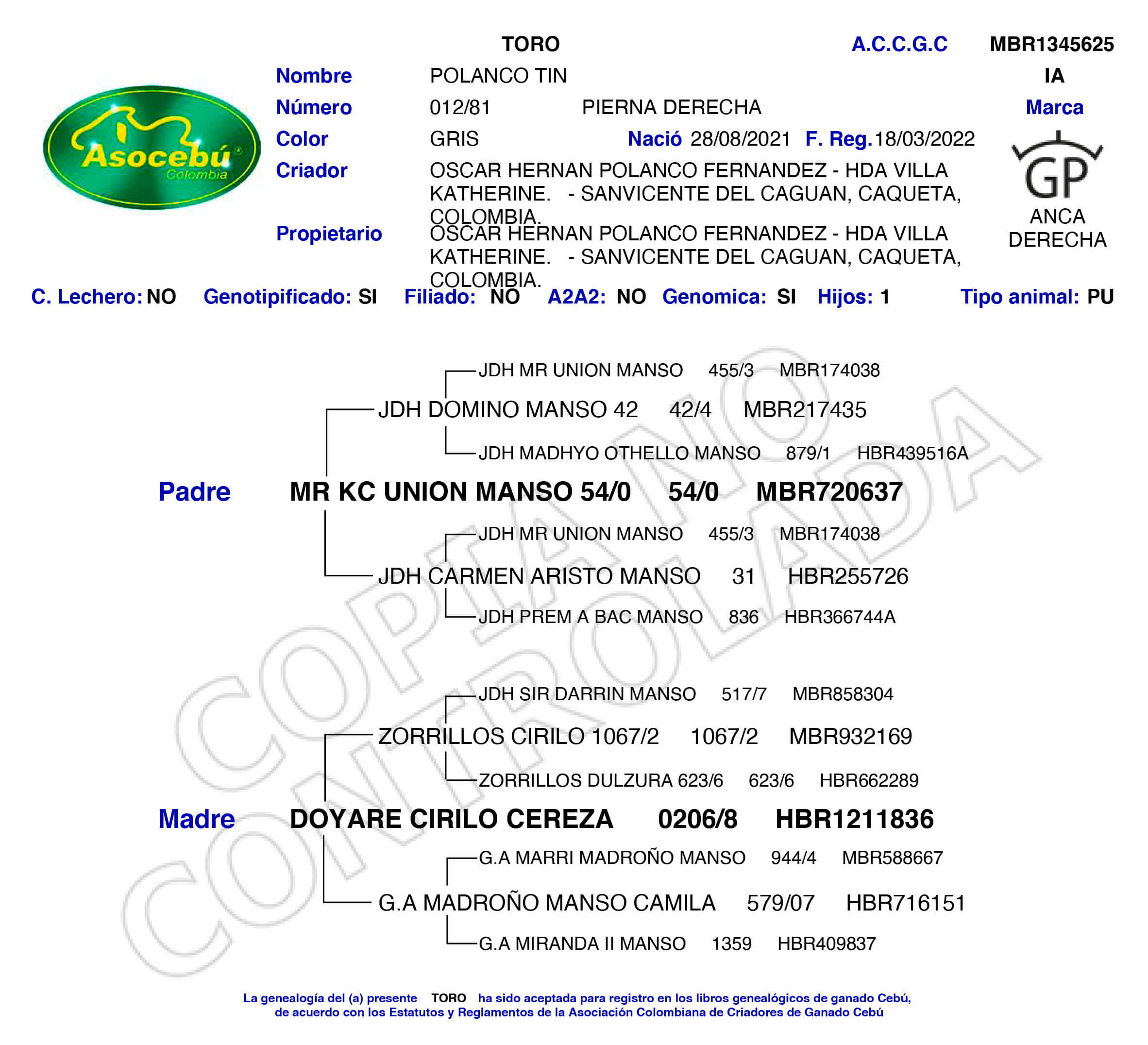 NÚMERO: 012/81    REGISTRO: MBR134562    FECHA DE NACIMIENTO: 28/08/2021