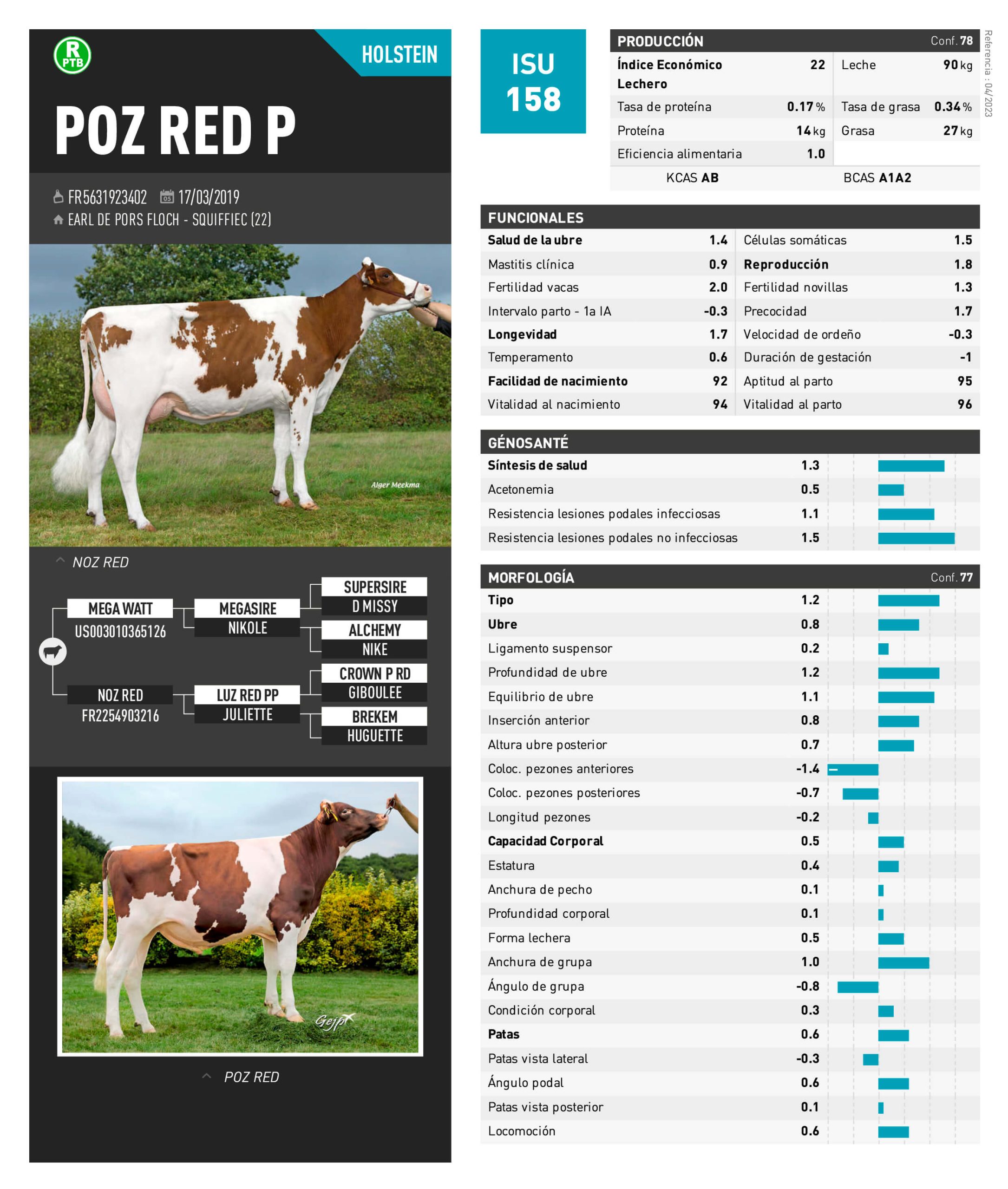 NOMBRE COMPLETO: POZ RED P NÚMERO: (Pendiente) REGISTRO: FR5631923402 FECHA DE NACIMIENTO: 17/03/2019 TIPO: LECHE – RAZA: HOLSTEIN ROJO PADRE: MEGA WATT MADRE: NOZ RED
