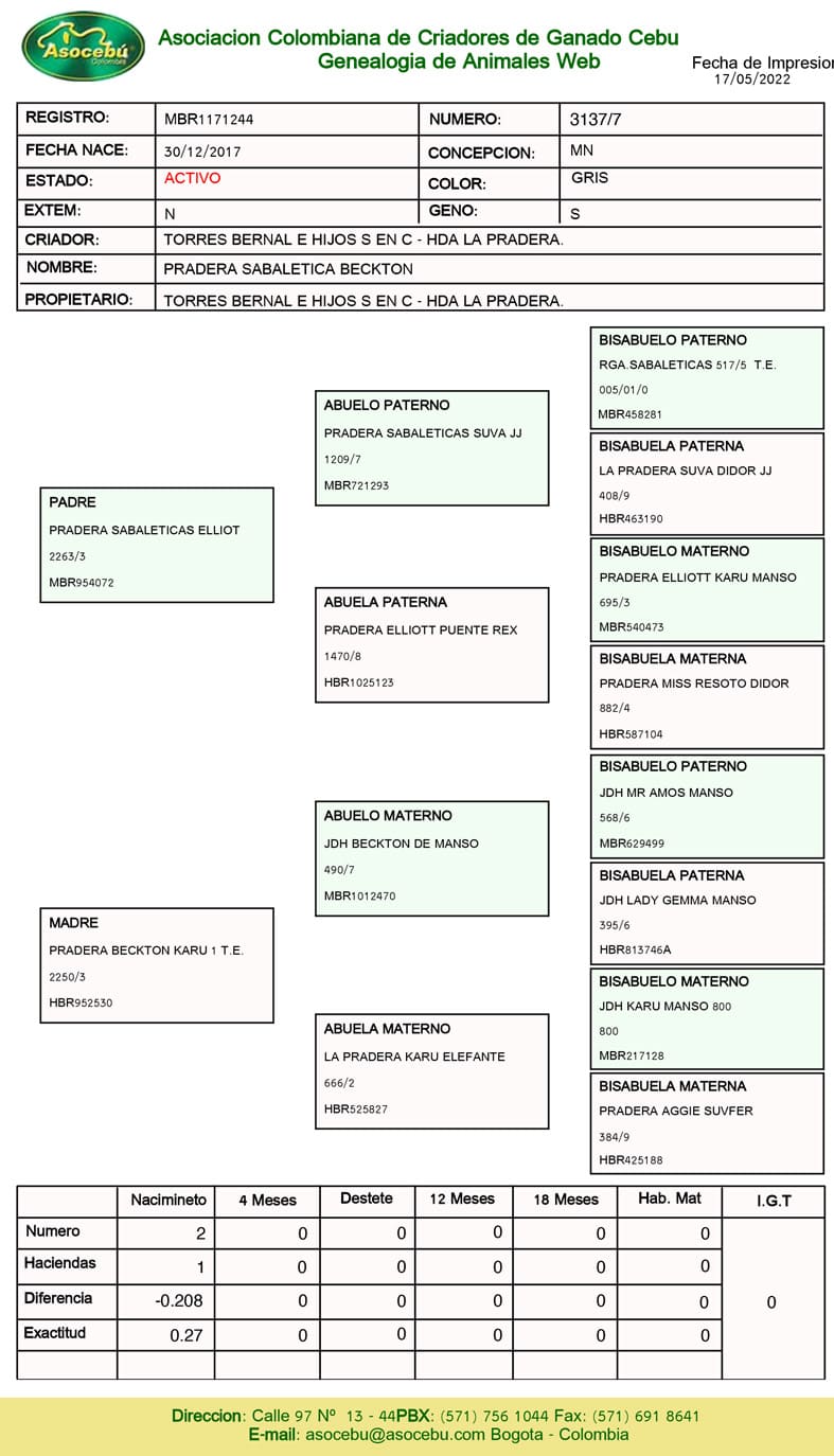 NOMBRE COMPLETO: PRADERA SABALETICA BECKTON NÚMERO: 3137/7 REGISTRO: MBR1171244 FECHA DE NACIMIENTO: 30/12/2017 TIPO: CARNE – RAZA: BRAHMAN GRIS PADRE: PRADERA SABALETICAS ELLIOT MADRE: PRADERA BECKTON KARU 1 T.E.
