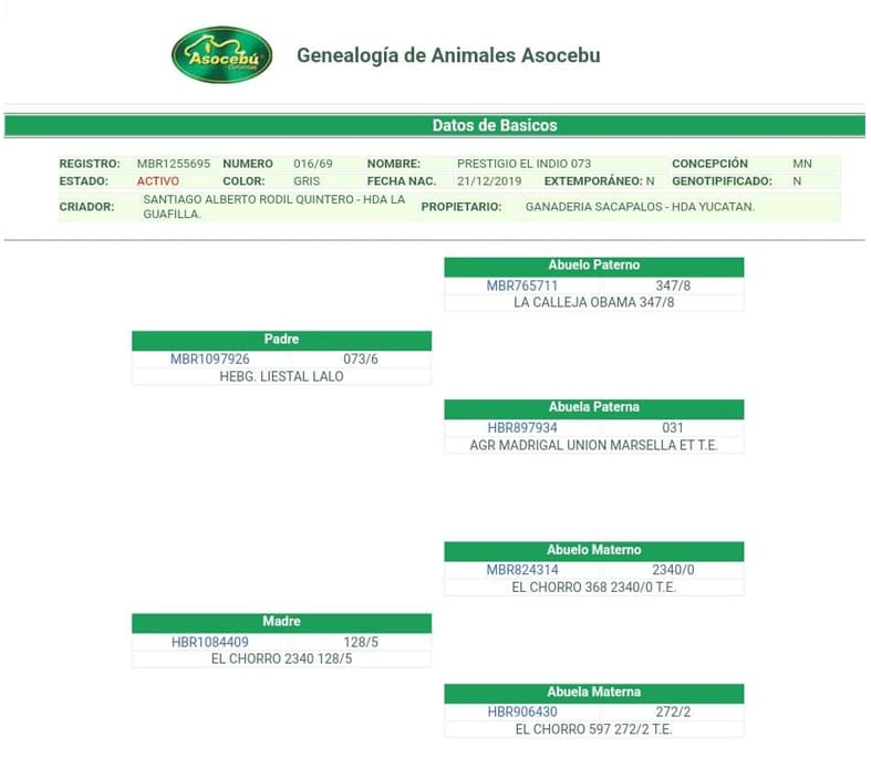 NOMBRE COMPLETO: PRESTIGIO EL INDIO 073 NÚMERO: 016/69 REGISTRO: MBR1255695 FECHA DE NACIMIENTO: 21/12/2019 TIPO: CARNE – RAZA: BRAHMAN GRIS PADRE: HEBG. LIESTAL LALO MADRE: EL CHORRO 2340