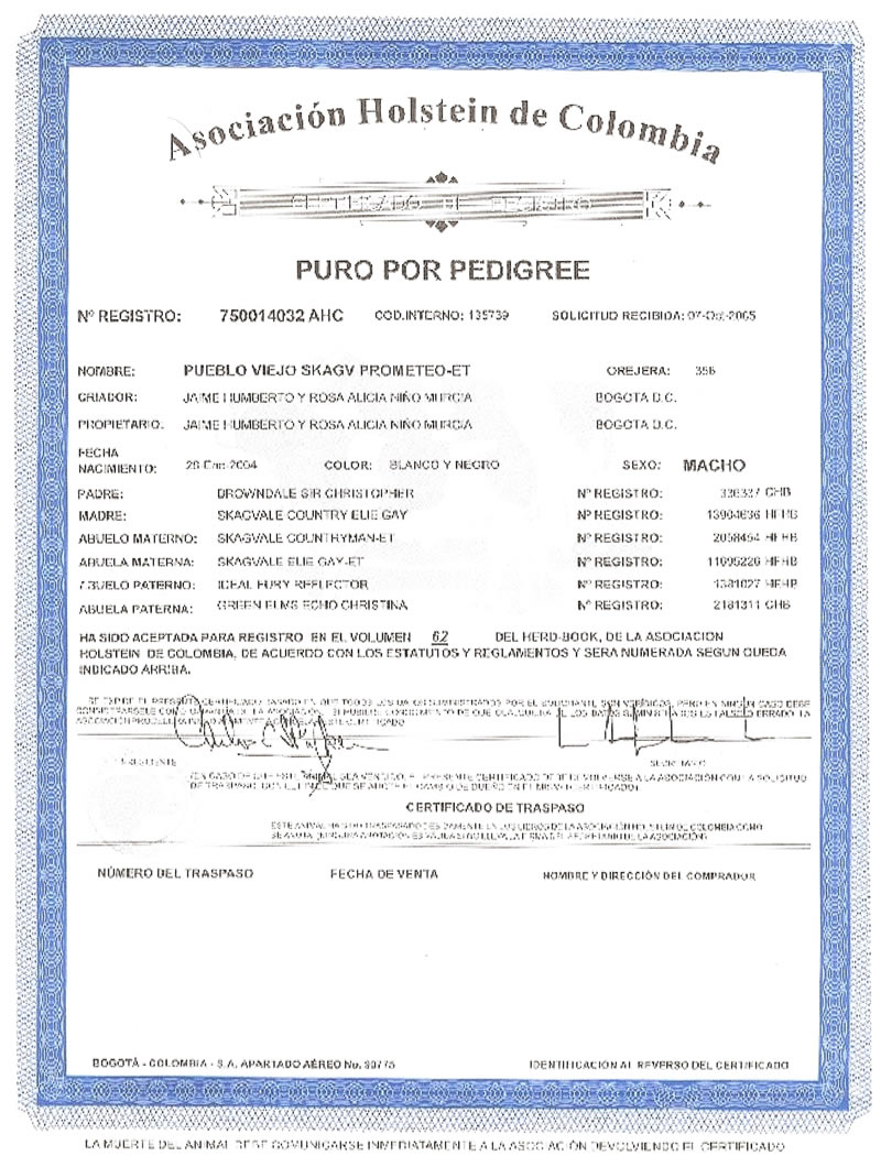 NOMBRE COMPLETO: P. Viejo Skagvale Prometeo ET 356NÚMERO: 356 REGISTRO: 750014032 FECHA DE NACIMIENTO: 26/01/2004TIPO: LECHE – RAZA: HOLSTEIN NEGROPADRE: DROWNDALE SIR CHRISTOPHER MADRE: SKAGVALE COUNTRY ELIE GAY