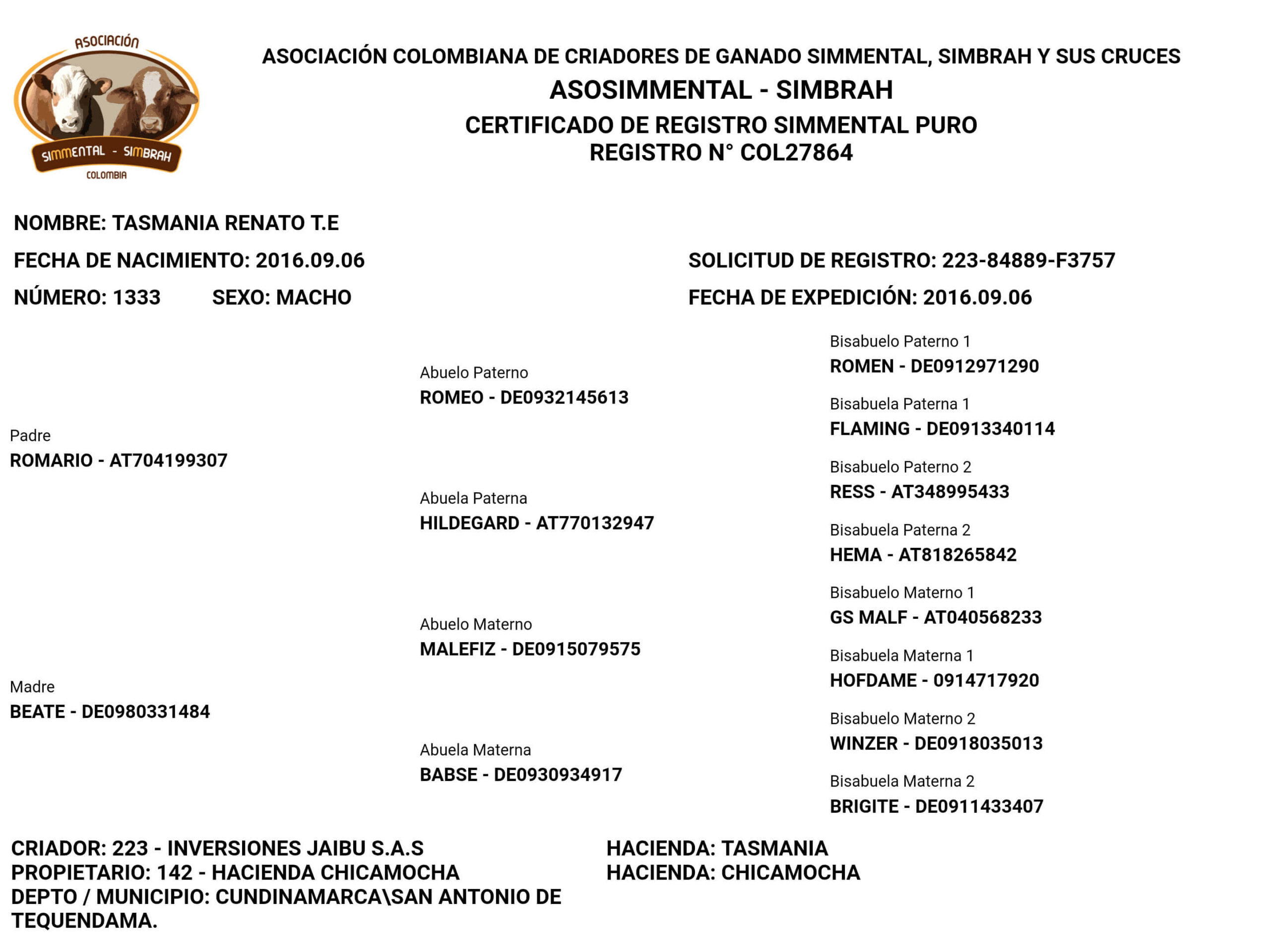NOMBRE COMPLETO: TASMANIA RENATO T.E.NÚMERO: 1333 REGISTRO: COL27864 FECHA DE NACIMIENTO: 06/09/2016TIPO: D.P. – RAZA: SIMMENTALPADRE: ROMARIO MADRE: BEATE