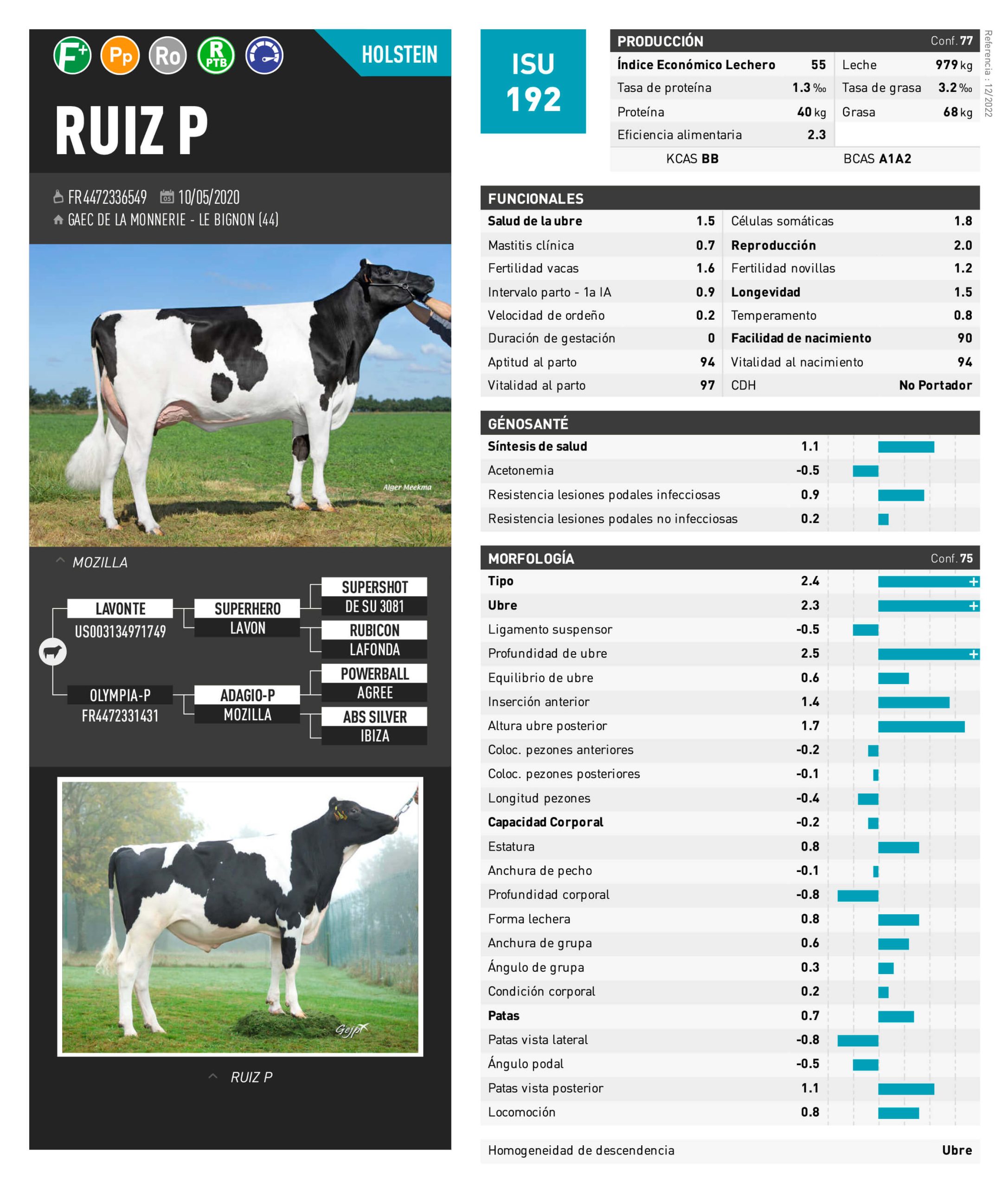 NOMBRE COMPLETO: RUIZ PNÚMERO: N/A REGISTRO: FR4472336549 FECHA DE NACIMIENTO: 10/05/2020TIPO: LECHE – RAZA: HOLSTEIN NEGROPADRE: LAVONTE MADRE: OLYMPIA-P