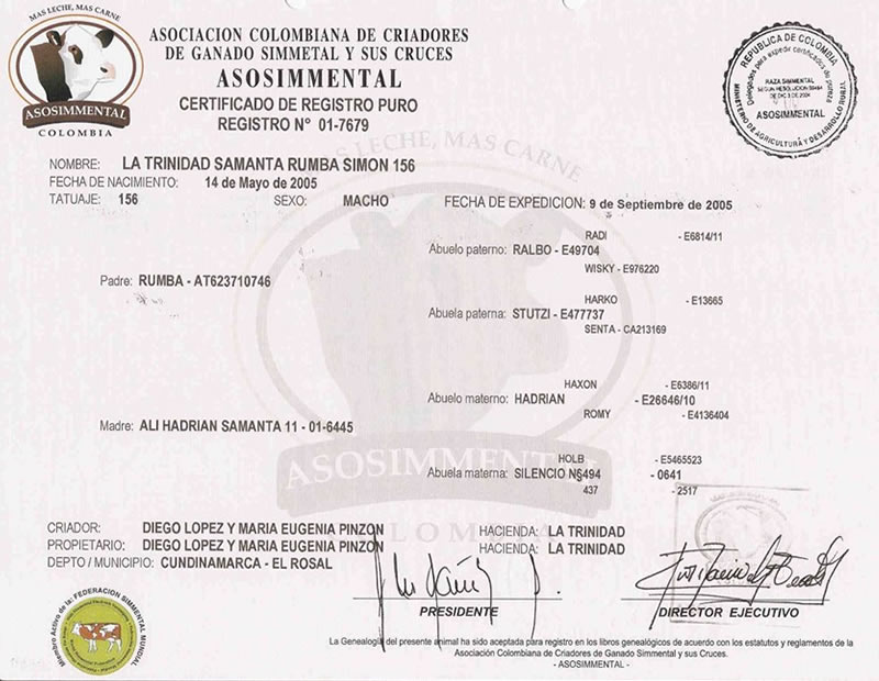 NOMBRE COMPLETO: La Trinidad Samanta Rumba Simon 156NÚMERO: 156 REGISTRO: 01-6445 FECHA DE NACIMIENTO: 14/05/2005TIPO: D.P. – RAZA: SIMMENTALPADRE: RUMBA MADRE: ALI HADRIAN SAMANTA