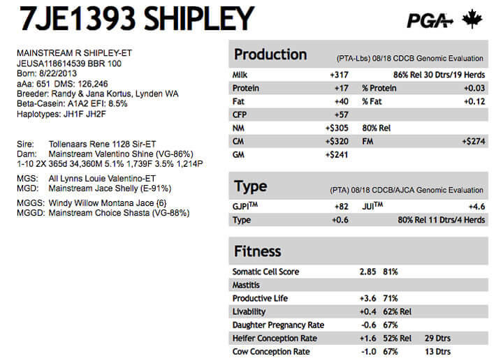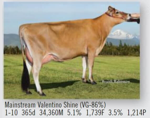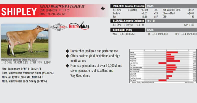 NOMBRE COMPLETO: MAINSTREAM R SHIPLEY-ET NÚMERO: 7JE1393 REGISTRO: JEUSA118614539 BBR 100 FECHA DE NACIMIENTO: 8/22/2013 TIPO: LECHE – RAZA: JERSEY PADRE: TOLLENAARS RENE 1128 SIR-ET MADRE: MAINSTREAM VALENTINO SHINE