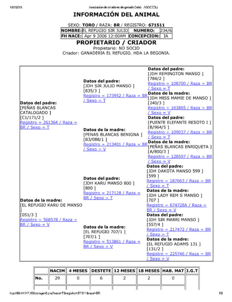 NOMBRE COMPLETO: EL REFUGIO SIR JULIO 234-6 NÚMERO: 234-6 REGISTRO: 671511 FECHA DE NACIMIENTO: 09/04/2006 TIPO: CARNE – RAZA: BRAHMAN GRIS PADRE: PEÑAS BLANCAS CATALOGADO MADRE: EL REFUGIO KARU DE MANSO