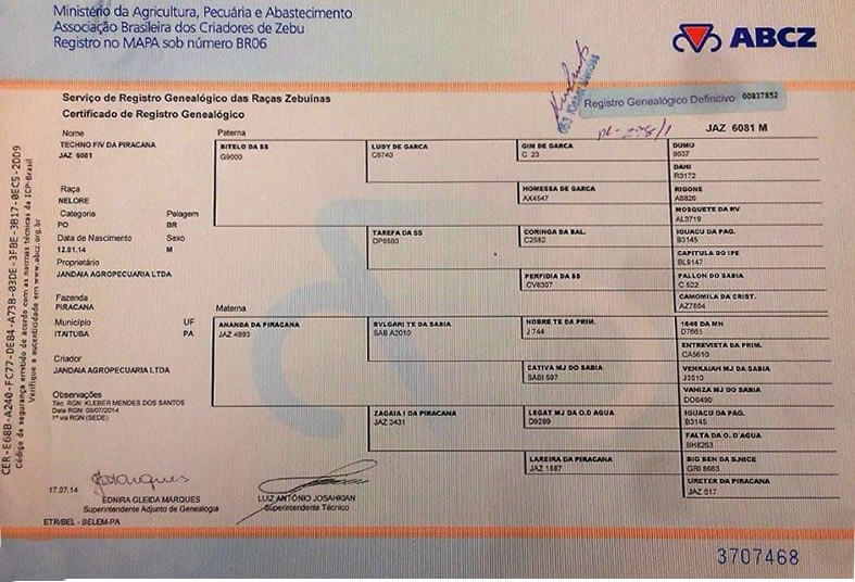 NOMBRE COMPLETO: Techno FIV Da Picarana Jaz 6081NÚMERO: JAZ 6081 REGISTRO: 00837852 FECHA DE NACIMIENTO: 12/01/2014TIPO: CARNE – RAZA: NELOREPADRE: BITELO DA ES MADRE: ANANDA DA PICARANA
