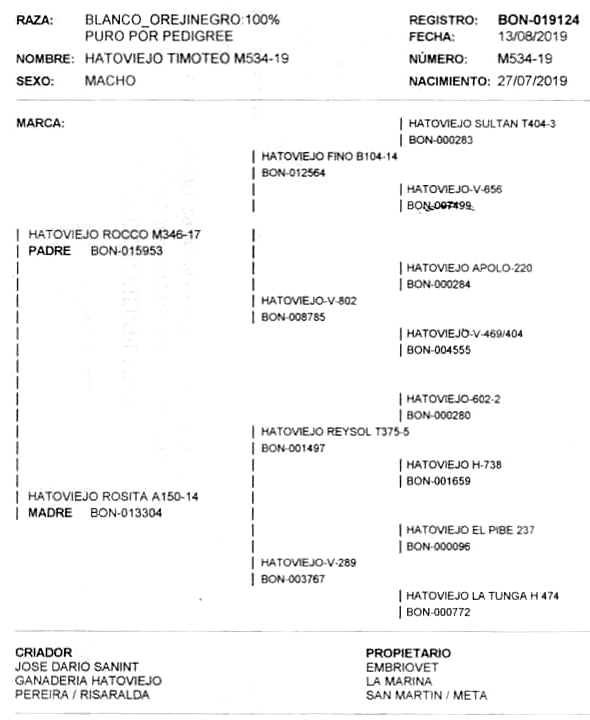NOMBRE COMPLETO: HATOVIEJO TIMOTEO M534-19NÚMERO: M534-19 REGISTRO: BON-019124 FECHA DE NACIMIENTO: 27/07/2019TIPO: D.P – RAZA: BONPADRE: HATOVIEJO ROCCO M346-17 MADRE: HATOVIEJO ROSITA A150-14