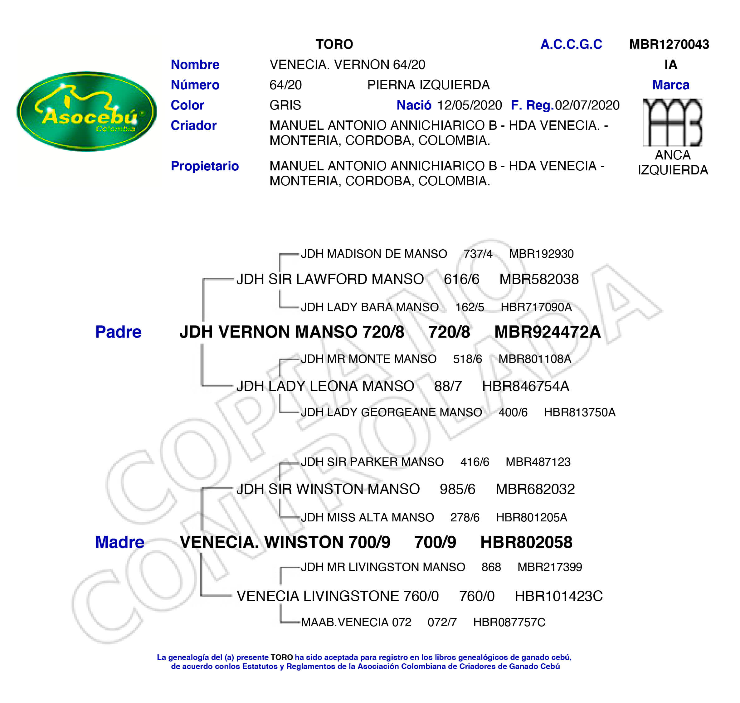 NÚMERO: 64/20    REGISTRO: MBR1270043    FECHA DE NACIMIENTO: 12/05/2020