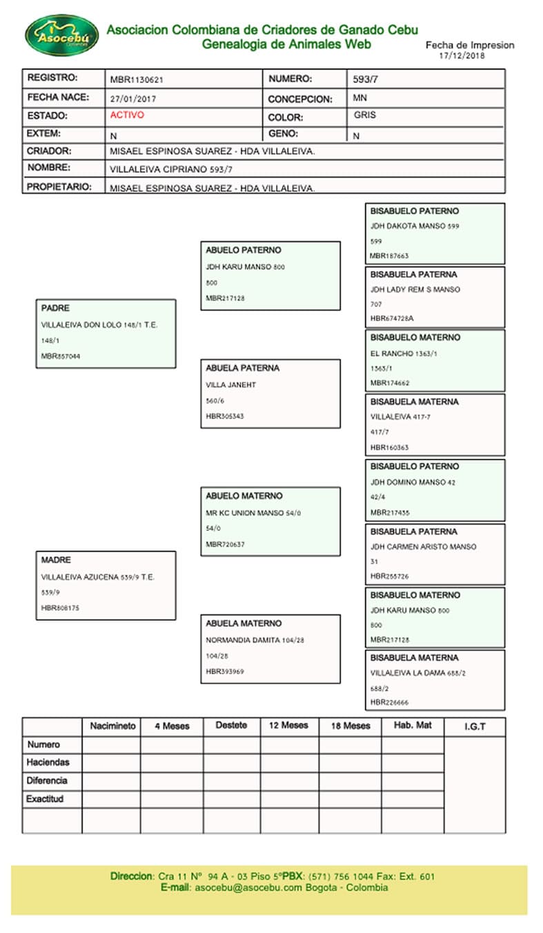 NOMBRE COMPLETO: VILLALEIVA CIPRIANO 593/7 NÚMERO: 593/7 REGISTRO: MBR1130621 FECHA DE NACIMIENTO: 27/01/2017 TIPO: CARNE – RAZA: BRAHMAN GRIS PADRE: VILLALEIVA DON LOLO 148/1 T.E. MADRE: VILLALEIVA AZUCENA 539/9 T.E.