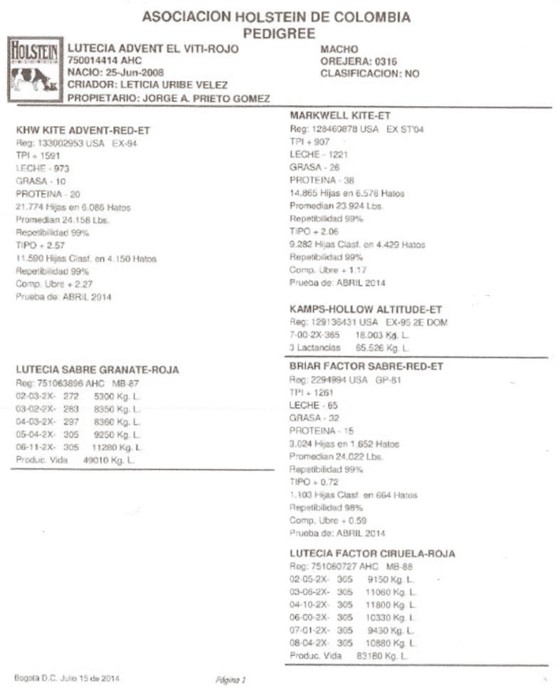NOMBRE COMPLETO: LUTECIA ADVENT EL VITI-ROJO NÚMERO: (Pendiente) REGISTRO: 128460878 USA FECHA DE NACIMIENTO: 25/06/2008 TIPO: LECHE – RAZA: HOLSTEIN ROJA PADRE: KHW KITE ADVENT RED-T MADRE: LUTECIA SABRE GRANATE ROJA