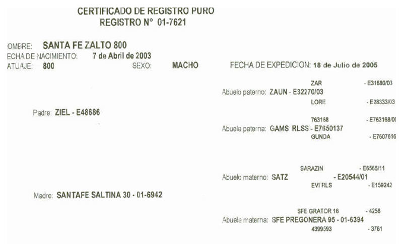 NOMBRE COMPLETO: Santa FE Zalto 800NÚMERO: 800 REGISTRO: 01-7621 FECHA DE NACIMIENTO: 04/07/2003TIPO: D.P. – RAZA: SIMMENTALPADRE: ZIEL MADRE: SANTAFE SALTINA 3