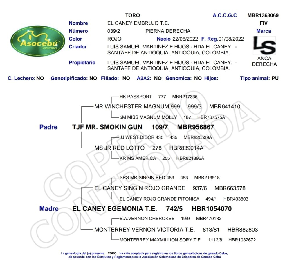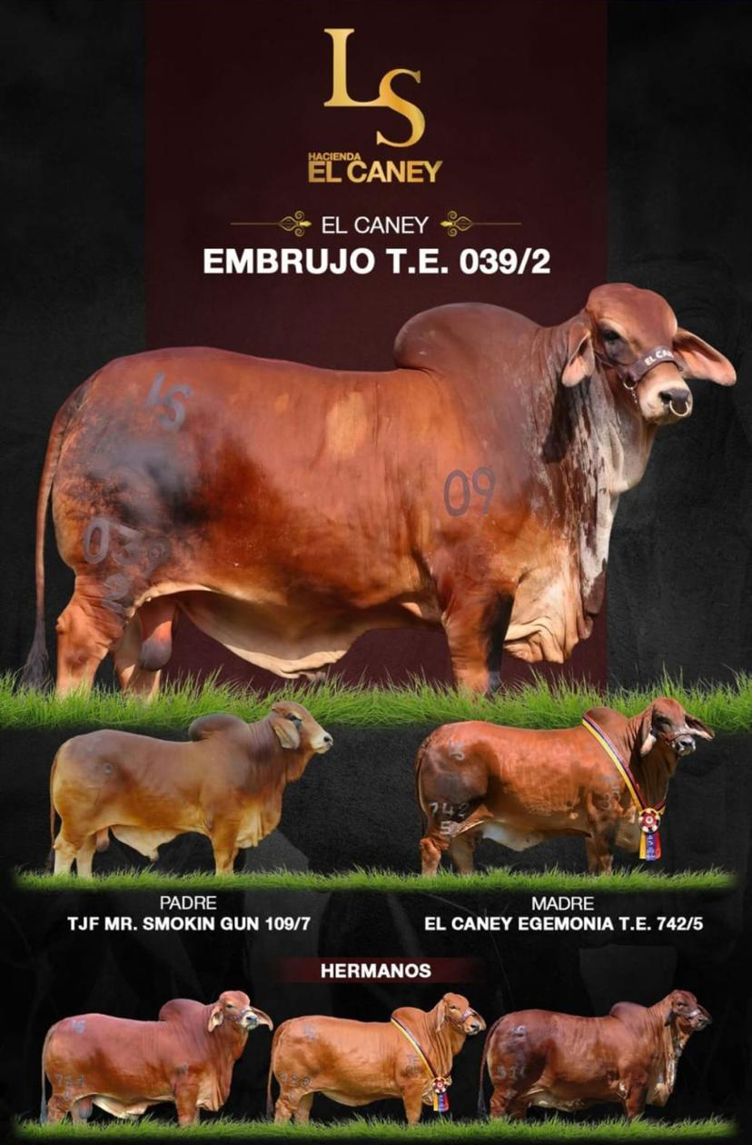 PADRE: TFJ MR. SMOKIN GUN 109/7 MADRE: EL CANEY EGEMONIA T.E. 742/5 RAZA: BRAHMAN ROJO